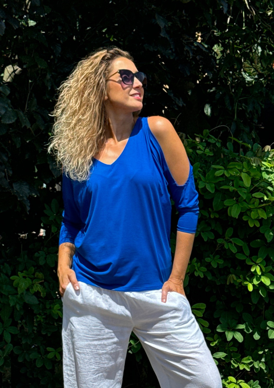 Volné dlouhé triko s vykrojením na ramenou je ušité z úpletu viskóza/elastan.