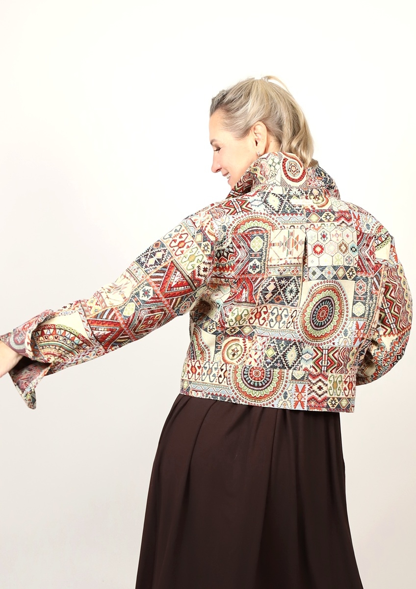 Střih připomíná džínovou bundu a zapíná se na knoflíky
