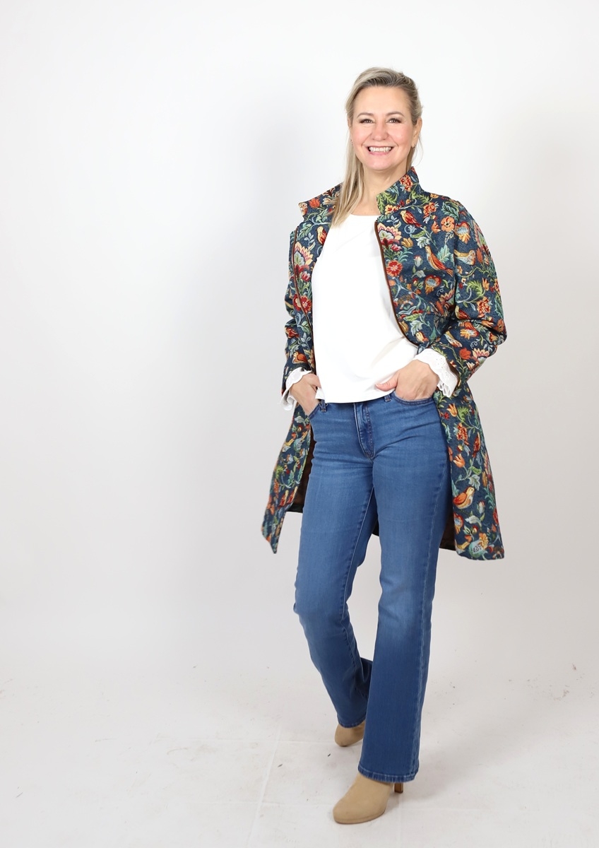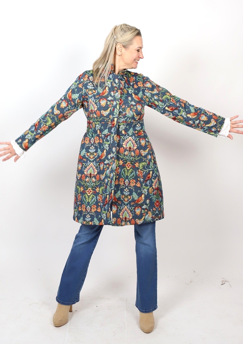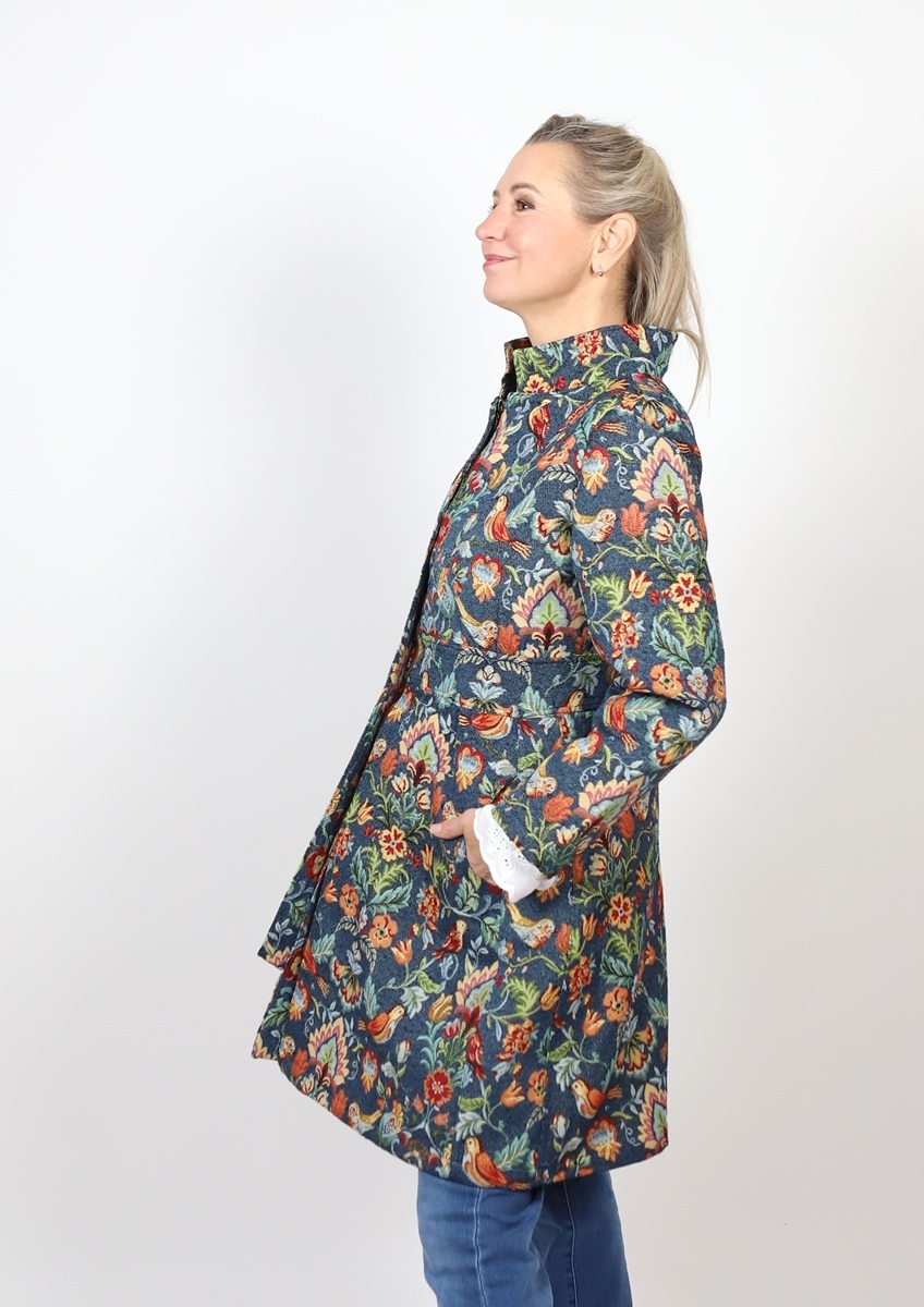 Kabátek je ušitý z žakárového materiálu s přírodním vzorem. Horní část je stažená do pásku, sukně je zvonová, v bočních švech jsou kapsy. Stojáčkový límec. (50%ba/50%Pes)
