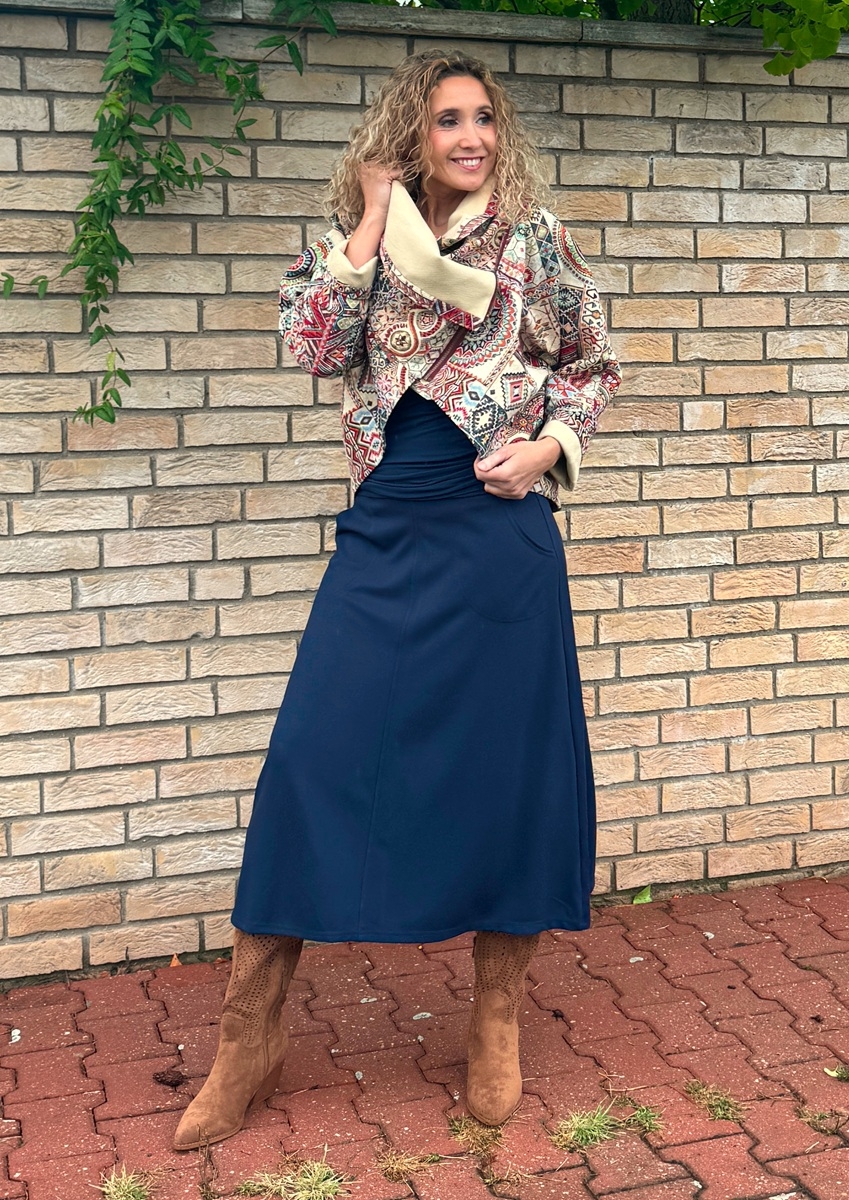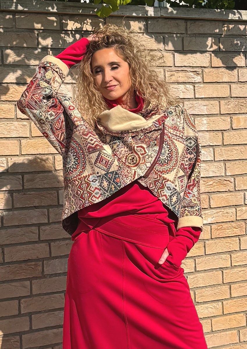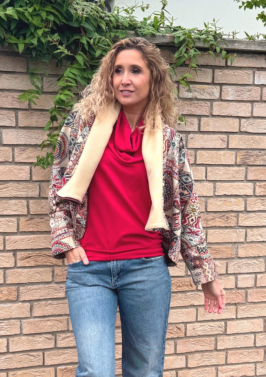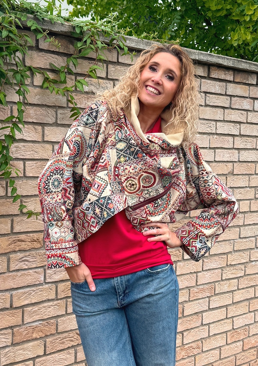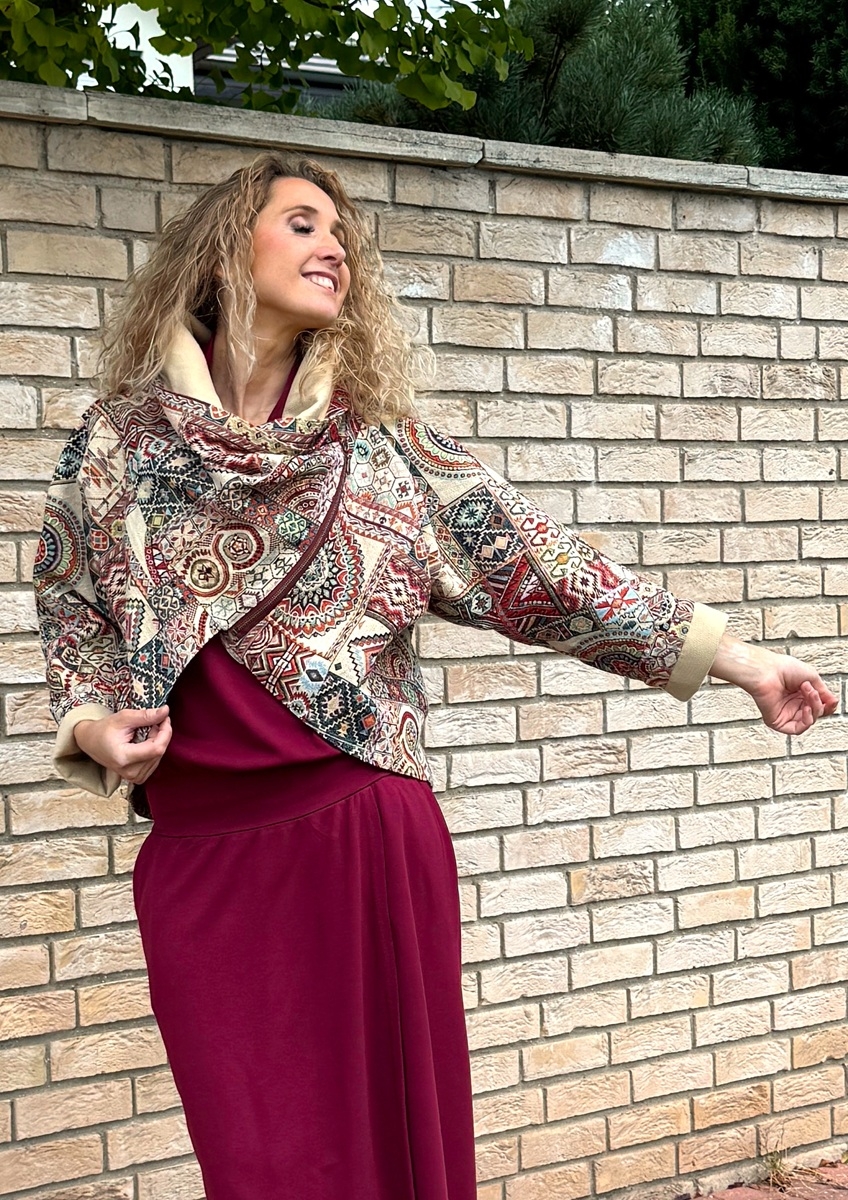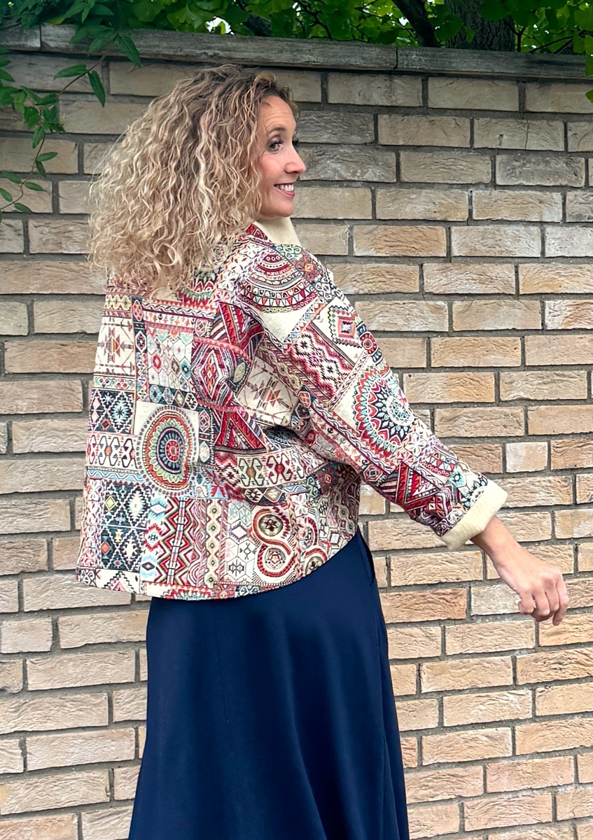Kabátek je ušitý z gobelínové látky (70%Pes 30%bavlna) podšívka 100% bavlna