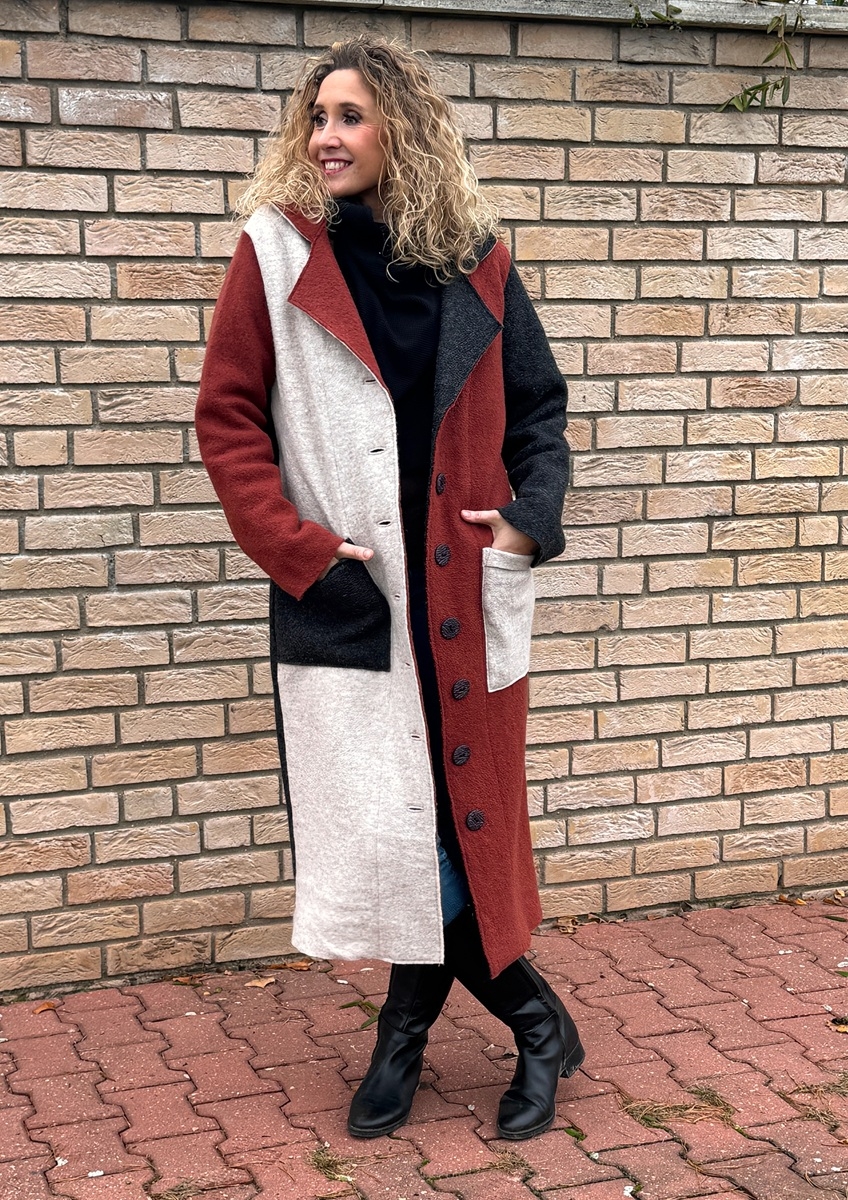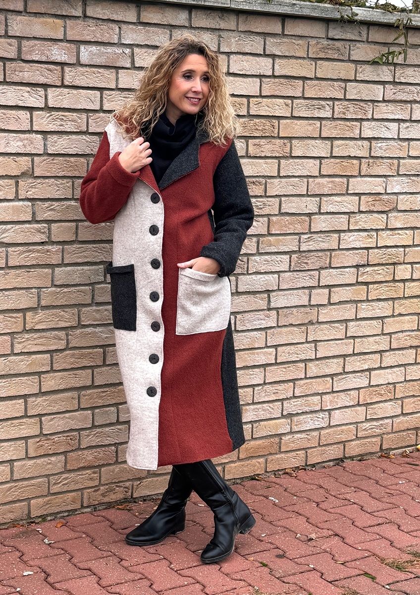 Kabát je ušitý z kabátové pařené vlny, bez podšívky. Střih je rovný a zapínání na knoflíky.