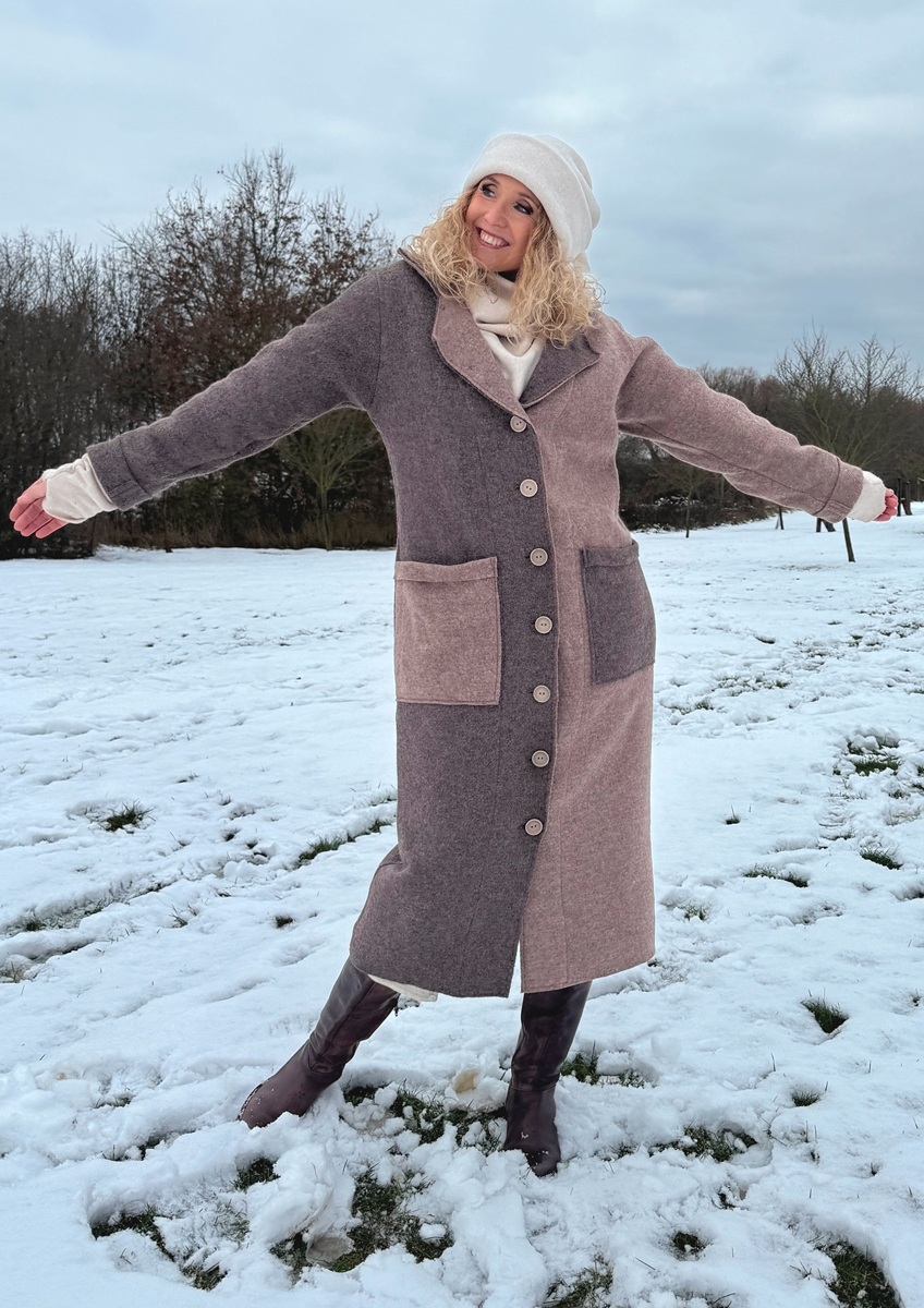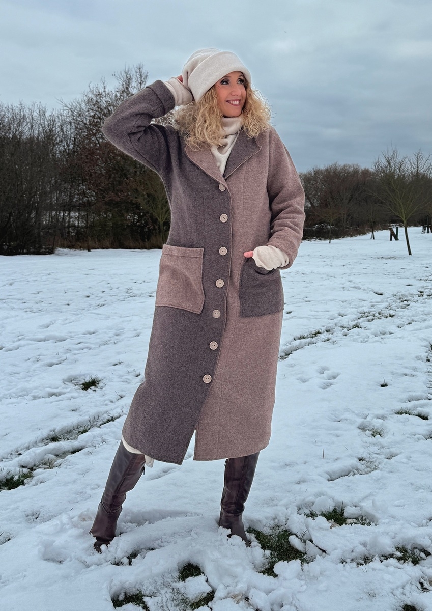 Kabát je ušitý z kabátové pařené vlny, bez podšívky Střih je rovný a zapínání na knoflíky.