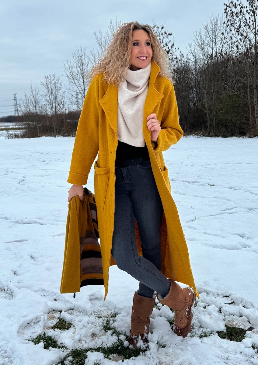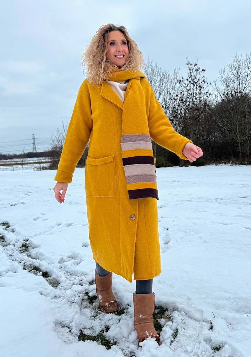 Kabát je ušitý z kabátové pařené vlny, bez podšívky. Střih je rovný a zapínání na knoflíky. Součástí je i ozdobná sešívaná šelá ze stejného materiálu.