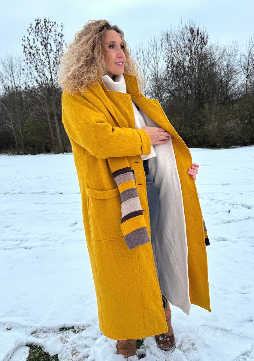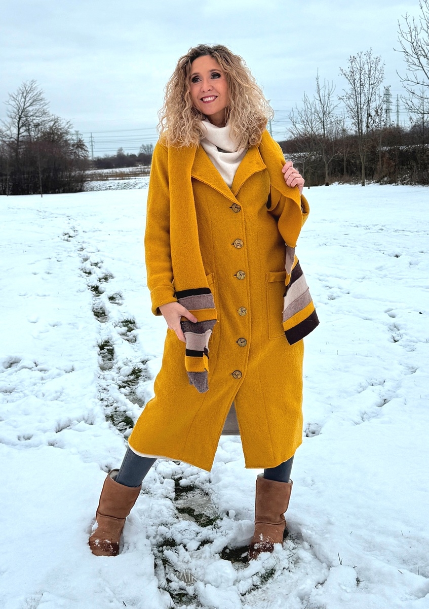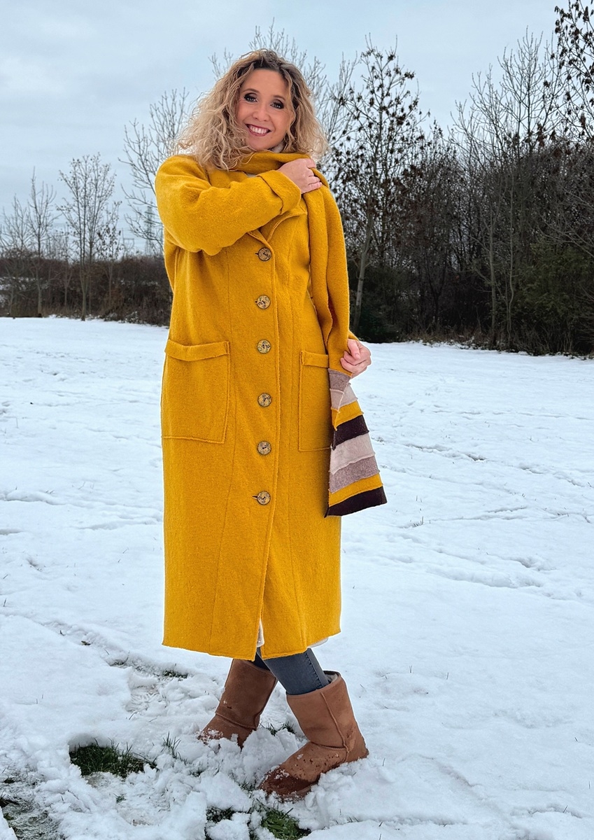 Kabát je ušitý z kabátové pařené vlny, bez podšívky Střih je rovný a zapínání na knoflíky. Součástí je i ozdobná sešívaná šelá ze stejného materiálu.