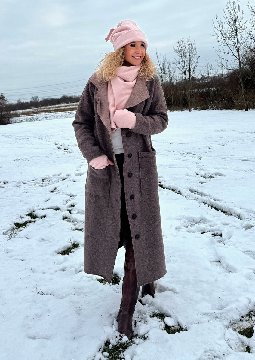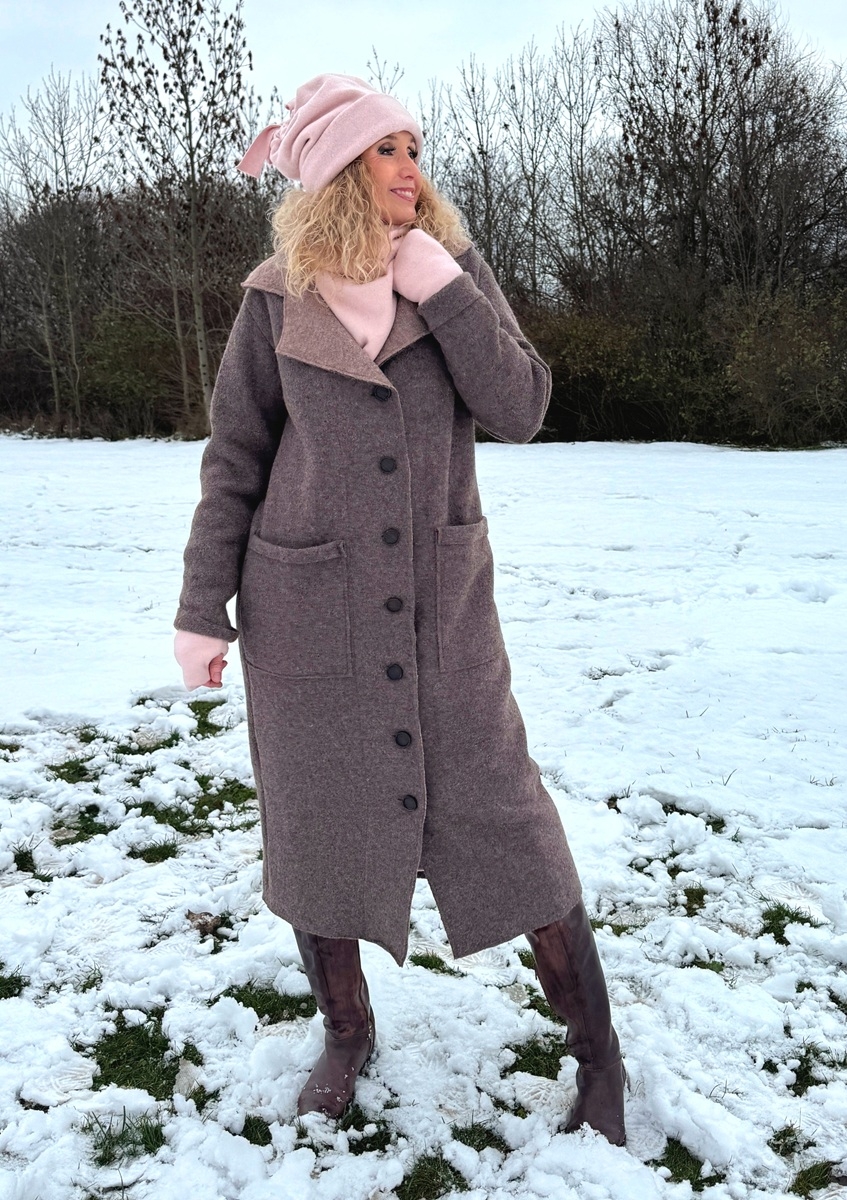 Kabát je ušitý z kabátové pařené vlny, bez podšívky. Střih je rovný a zapínání na knoflíky.
