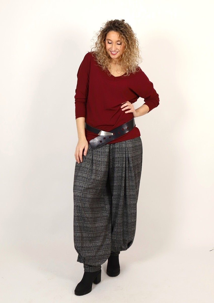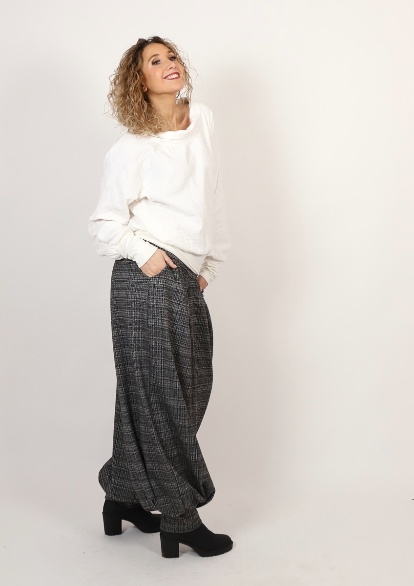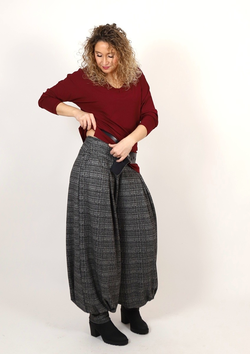 Široké dlouhé kalhoty dole stažené do širokého rantlu. Kalhoty jsou ušité ze středně silného úpletu - materiál (viskóza/polyester/elastan)