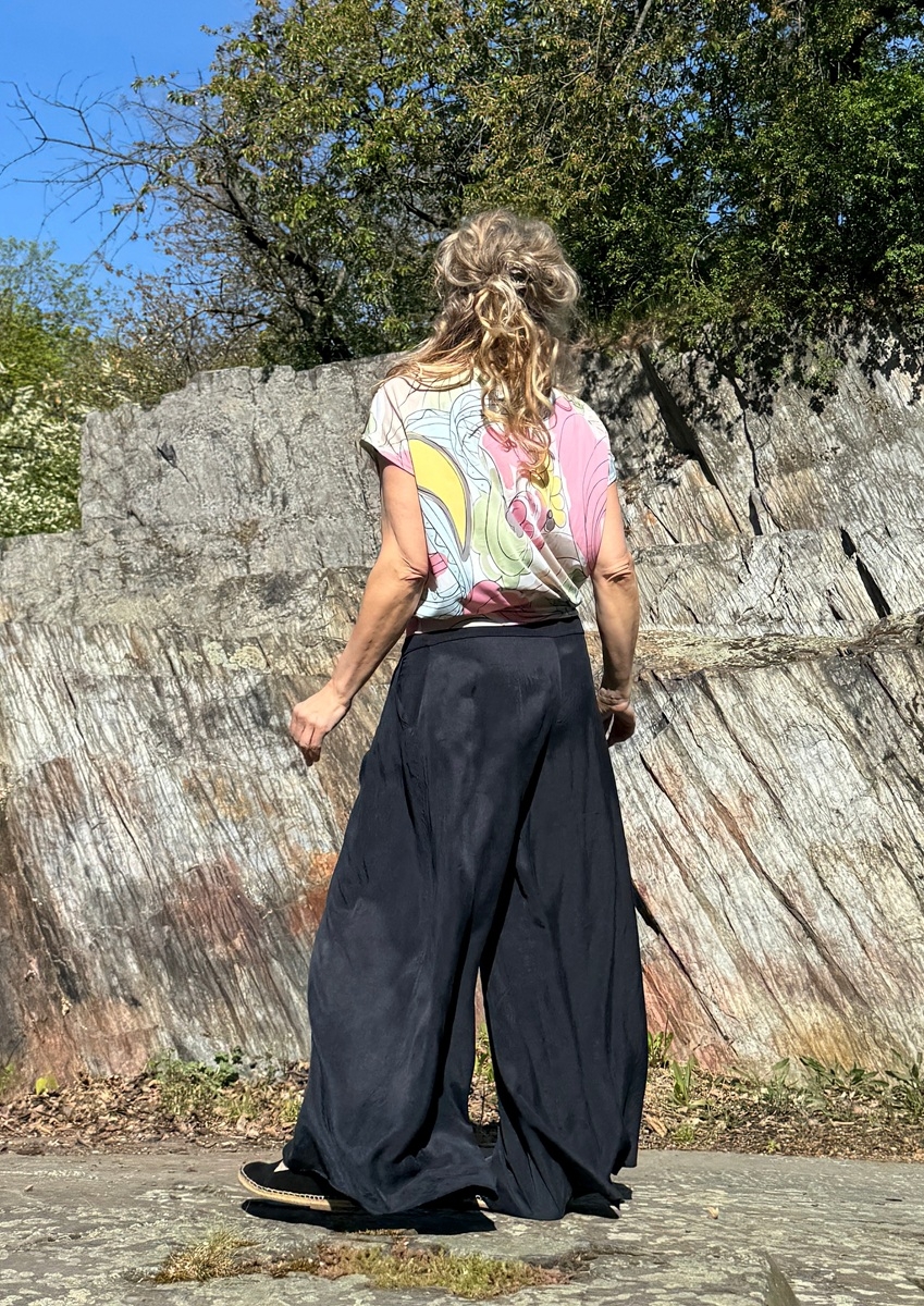Kalhoty jsou vyrobeny ze 100% viskózy (Tenzel) , lehkého ,vzdušného , rozevlátého, s jemným sametově hedvábným leskem. . V bočních švech jsou kapsy. Pásek je pružný, vyztužený proti vytažení.