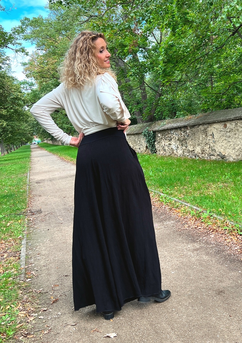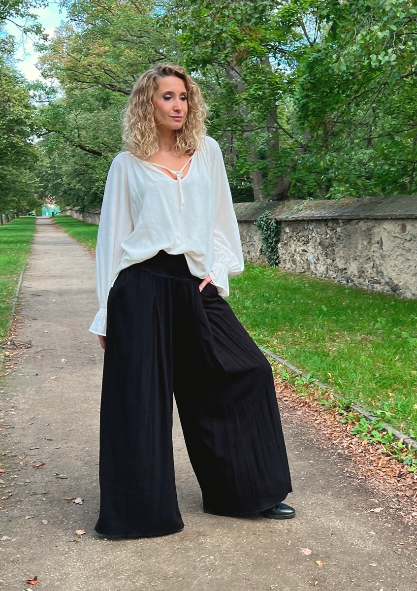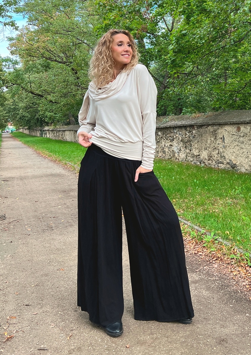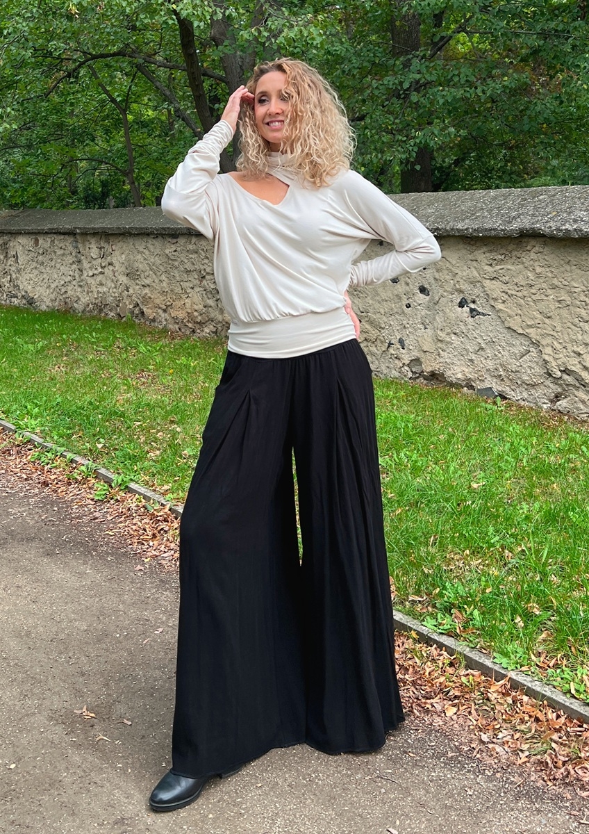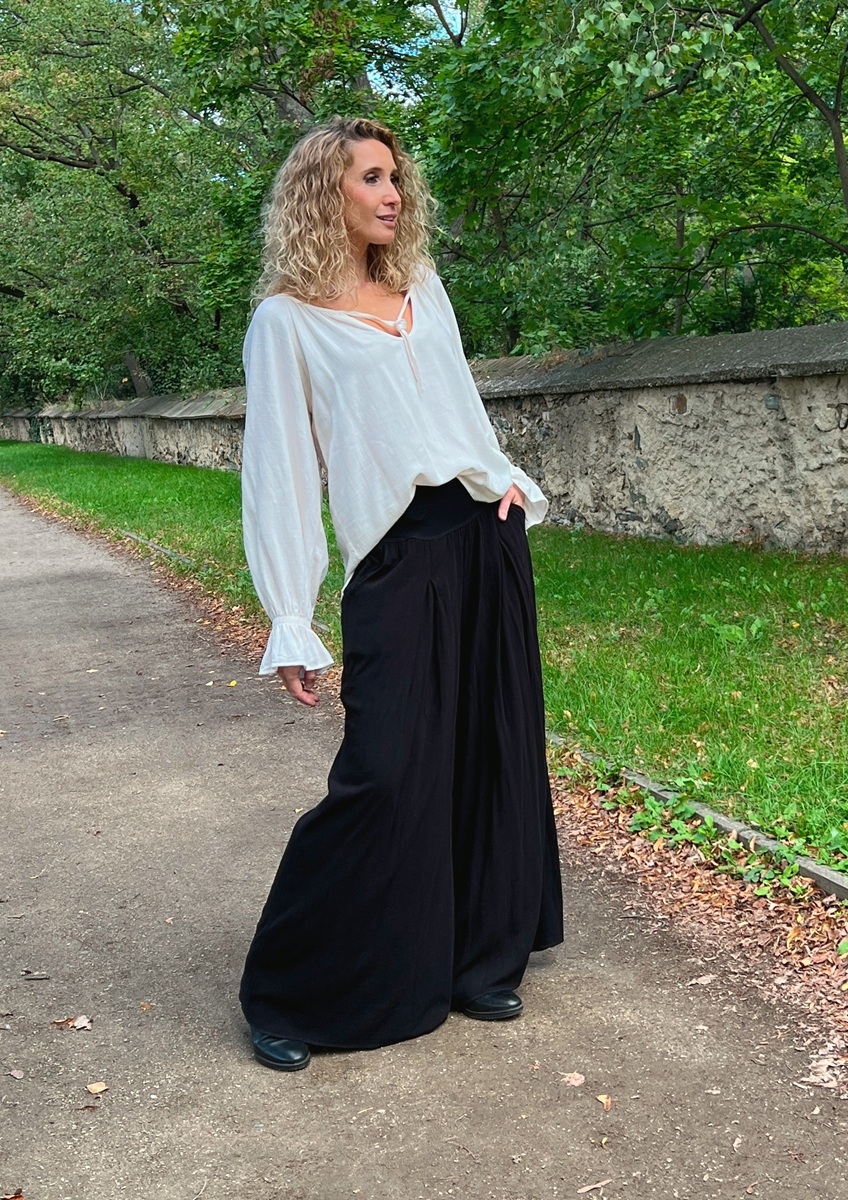 Široké lněné kalhoty do zvonu. Na první pohled působí jako sukně.