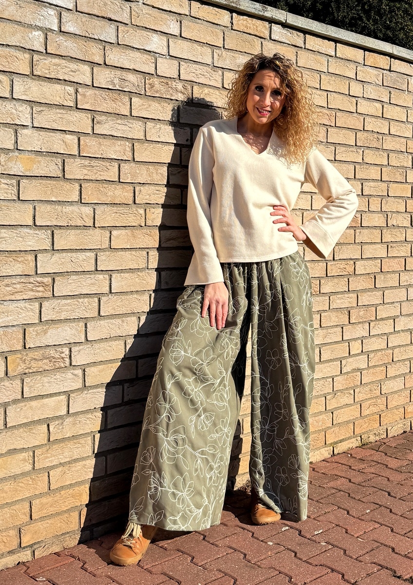Kalhoty jsou ušité ušité ze měsového materiálu (viskóza/len). V bočních švech jsou kapsy. Pásek je pružný, vyztužený proti vytažení.