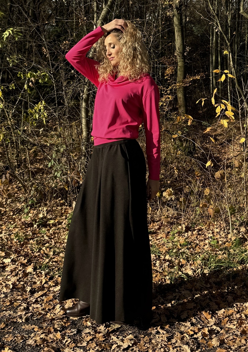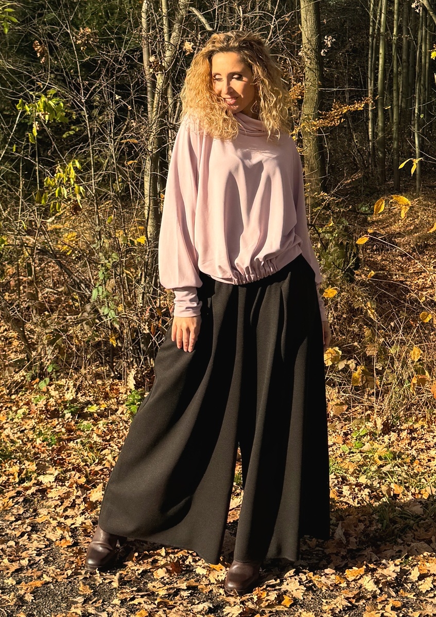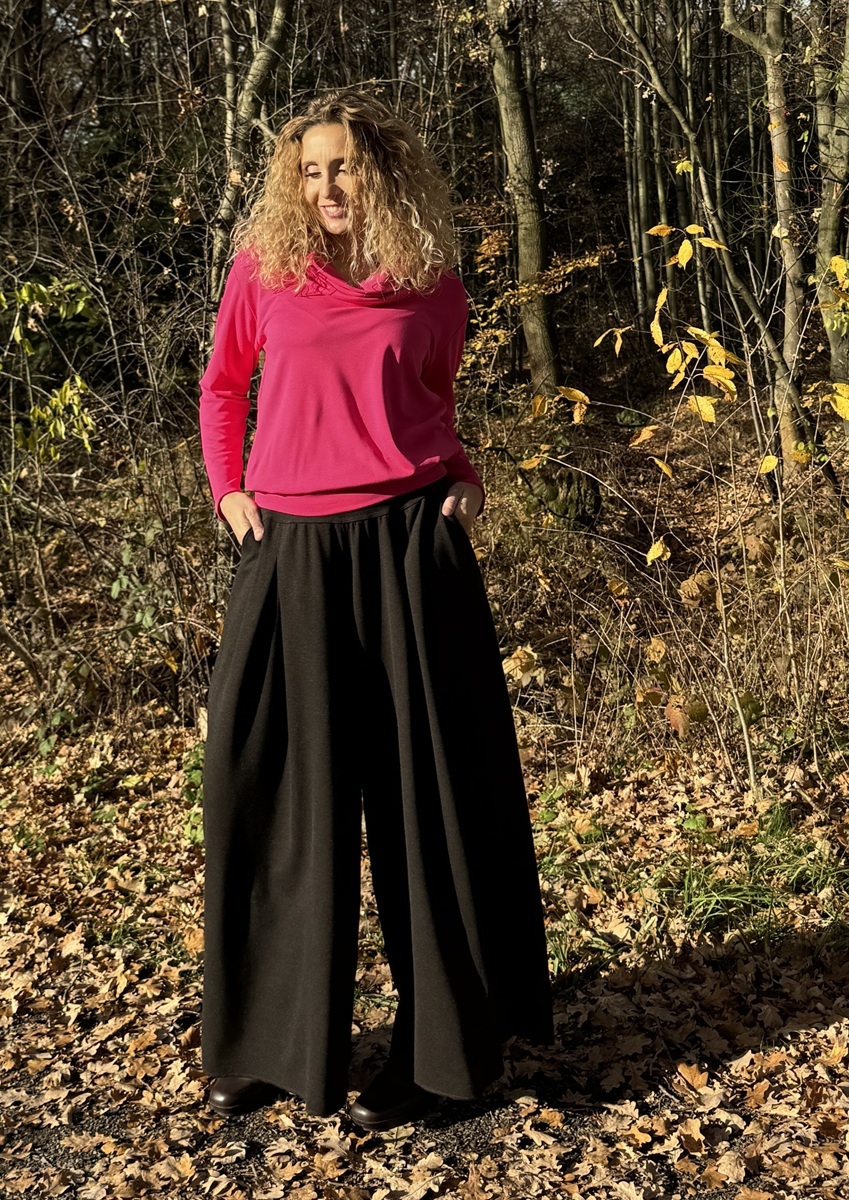 Široké kalhoty do zvonu. Na první pohled působí jako sukně.