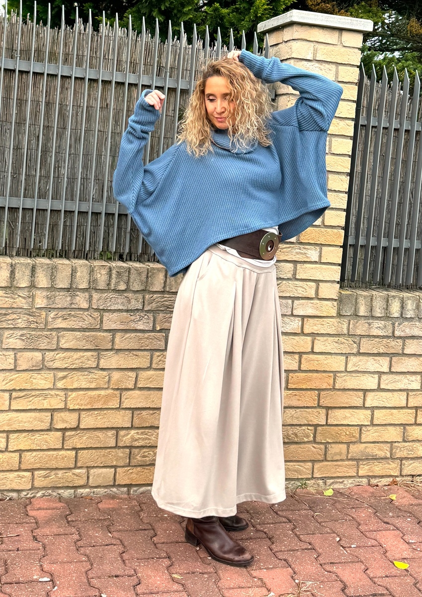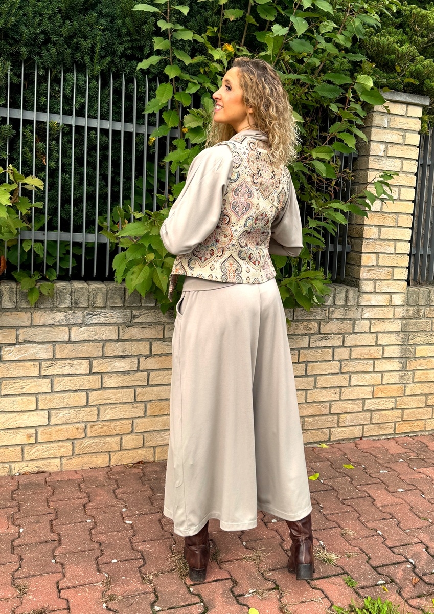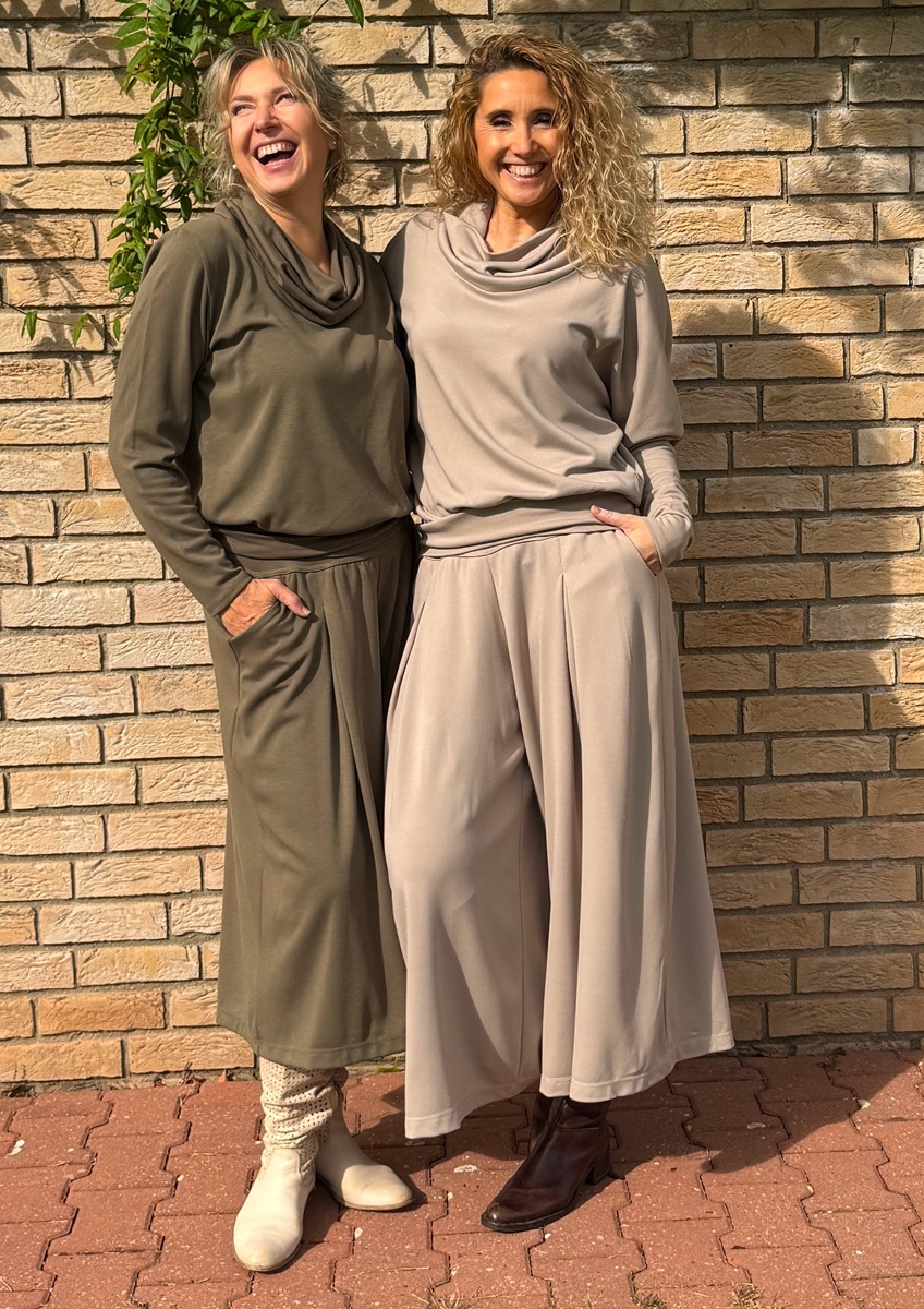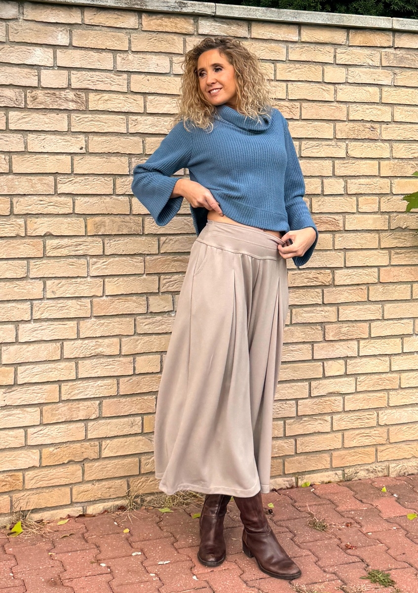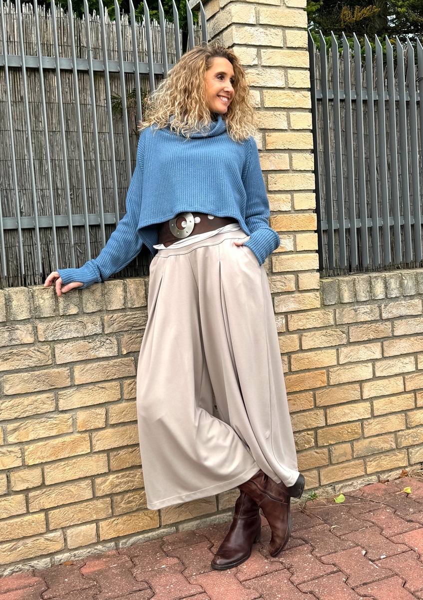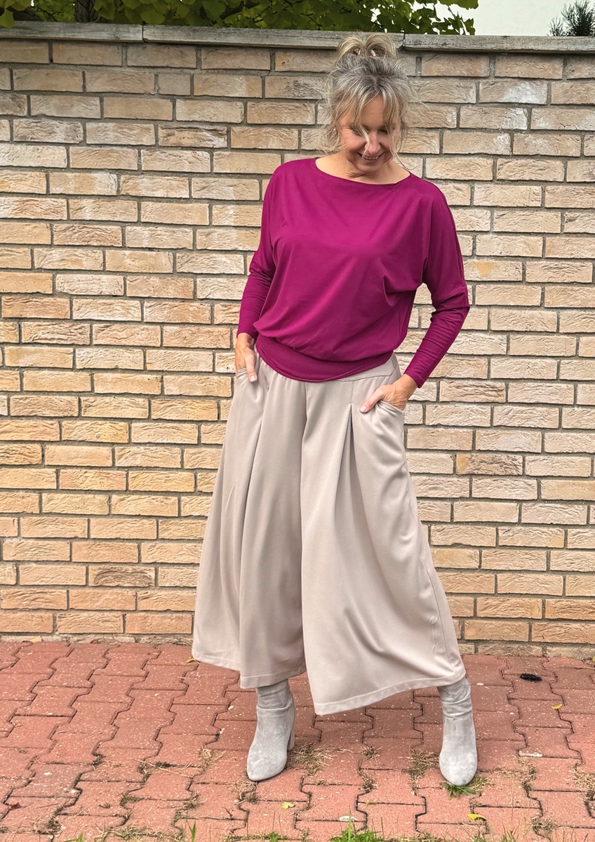 Široké kalhoty do zvonu. Na první pohled působí jako sukně. Kalhoty jsou ušité ze středního úpletu vis/pes/elast.