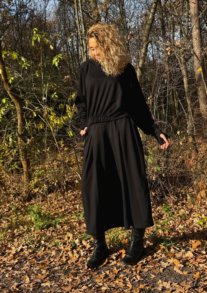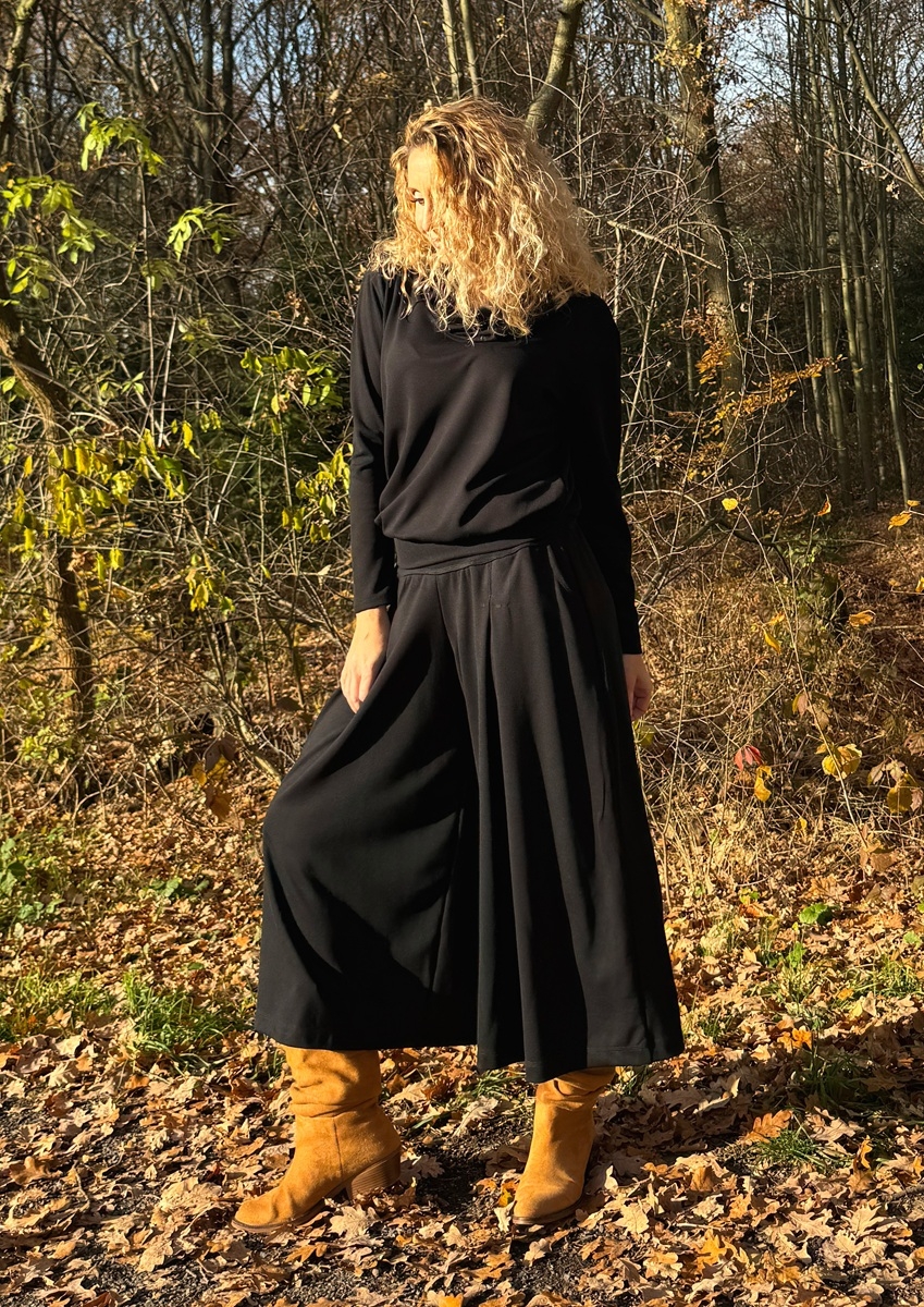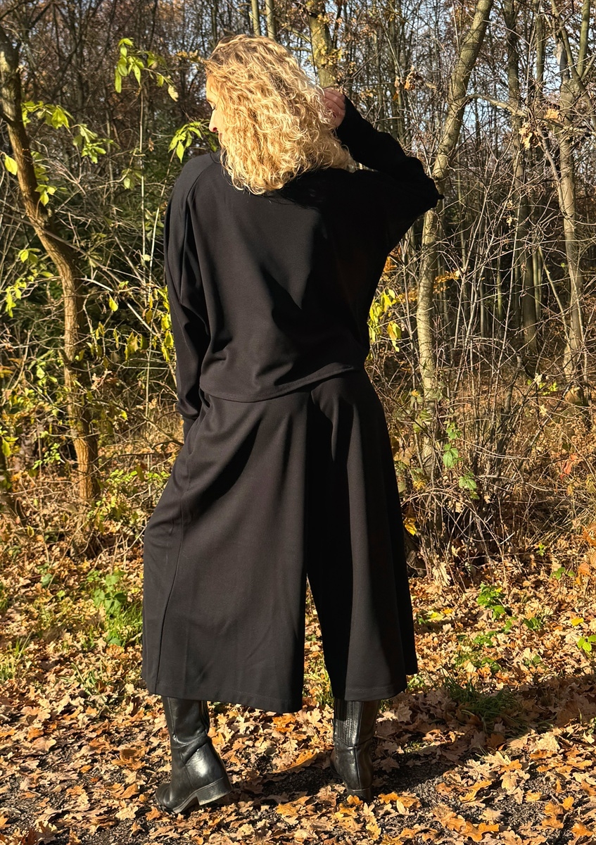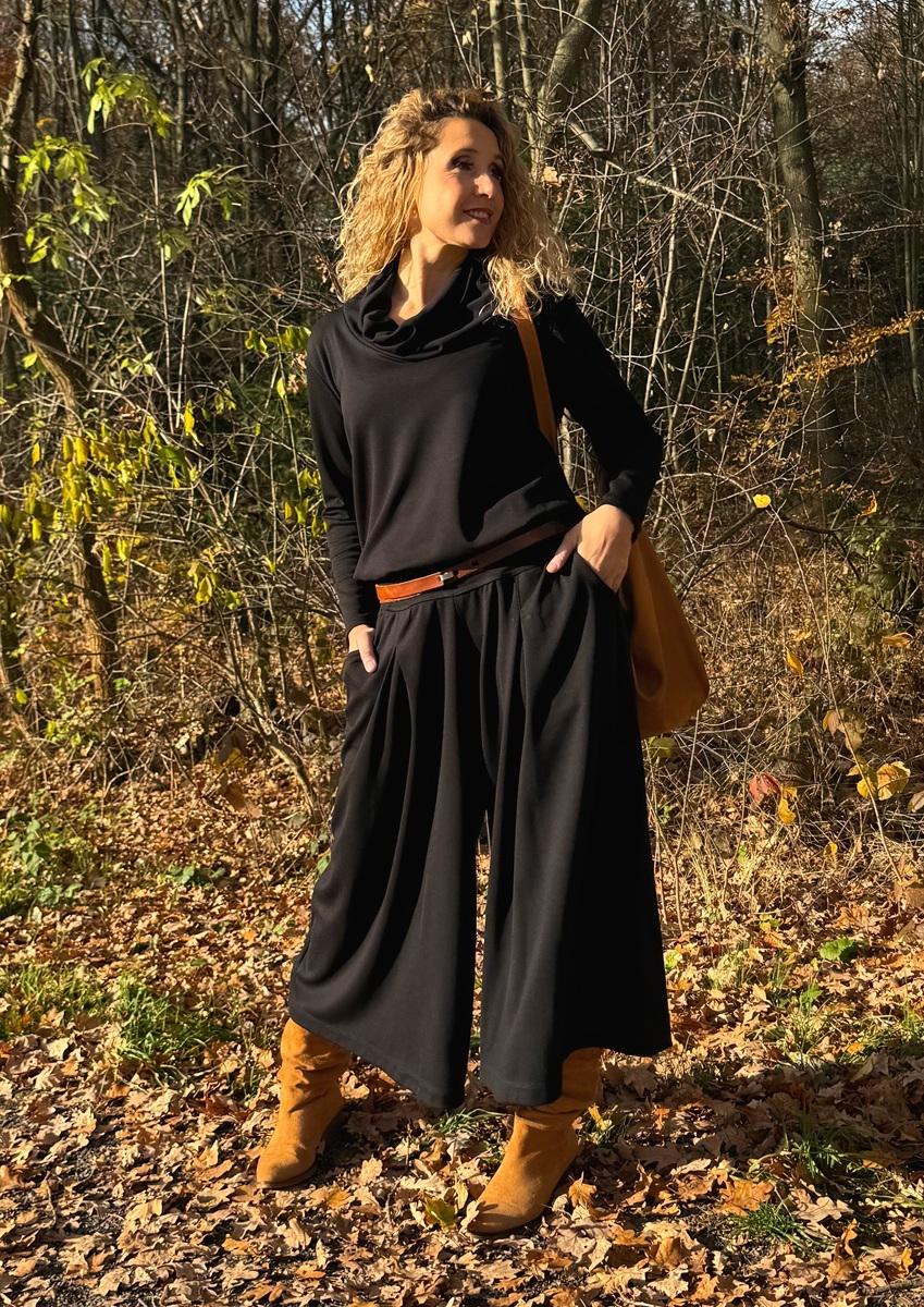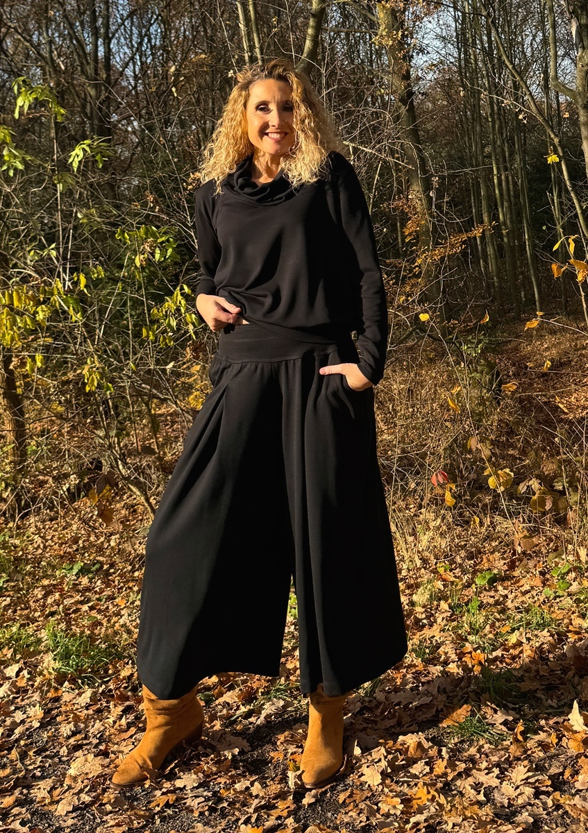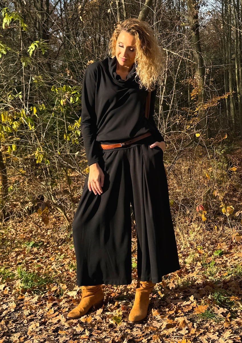 Široké kalhoty do zvonu. Na první pohled působí jako sukně. Kalhoty jsou ušité ze středního úpletu vis/pes/elast.