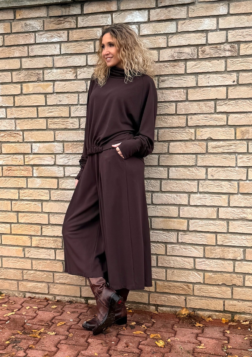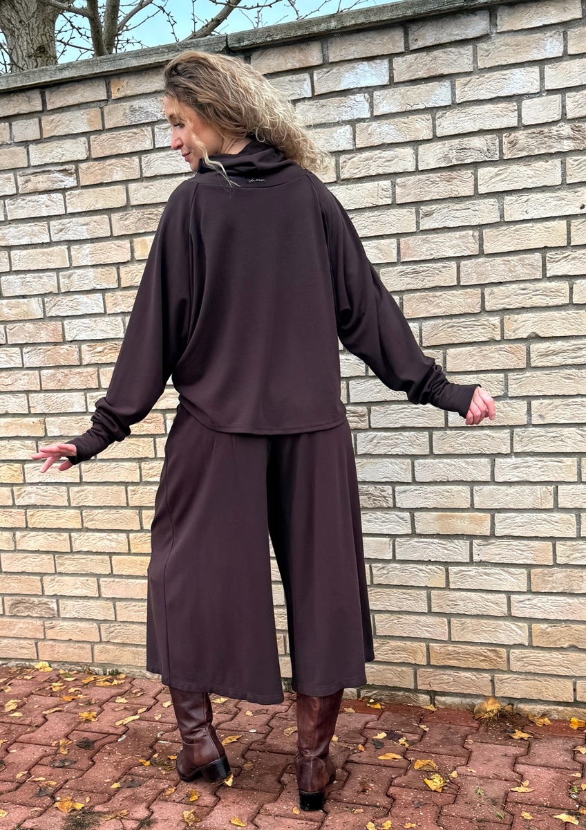 Široké kalhoty do zvonu. Na první pohled působí jako sukně. Kalhoty jsou ušité ze středně silného úpletu vis/pes/elast.