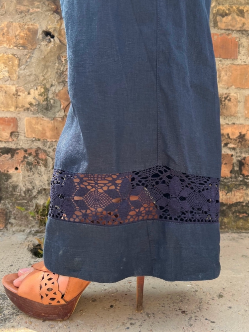 Pohodlný overal je šitý z lněné tkaniny, v pase je pružný pruh, a bočních švech kapsy. Ve spodní části nohavic je všitá krajka.