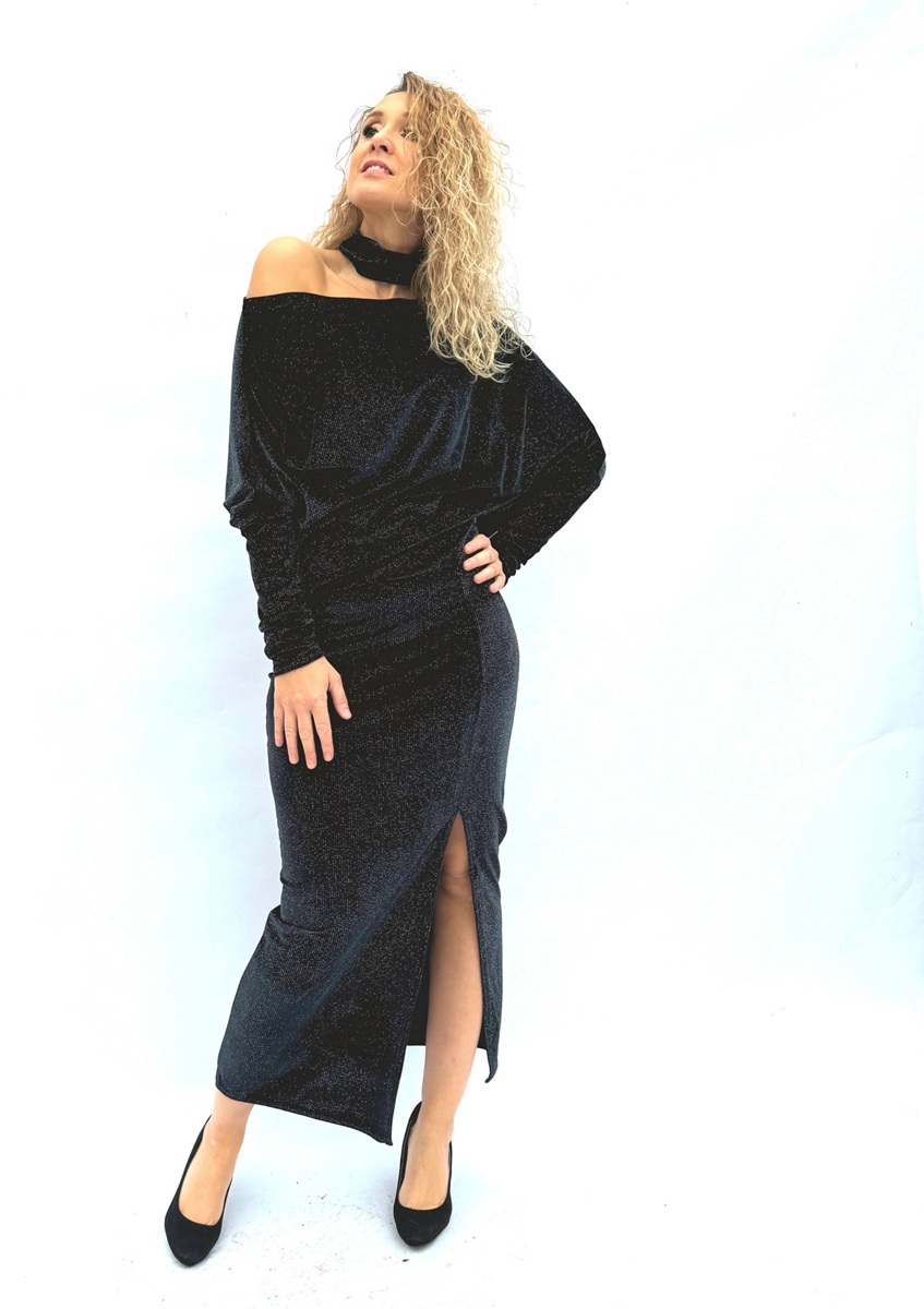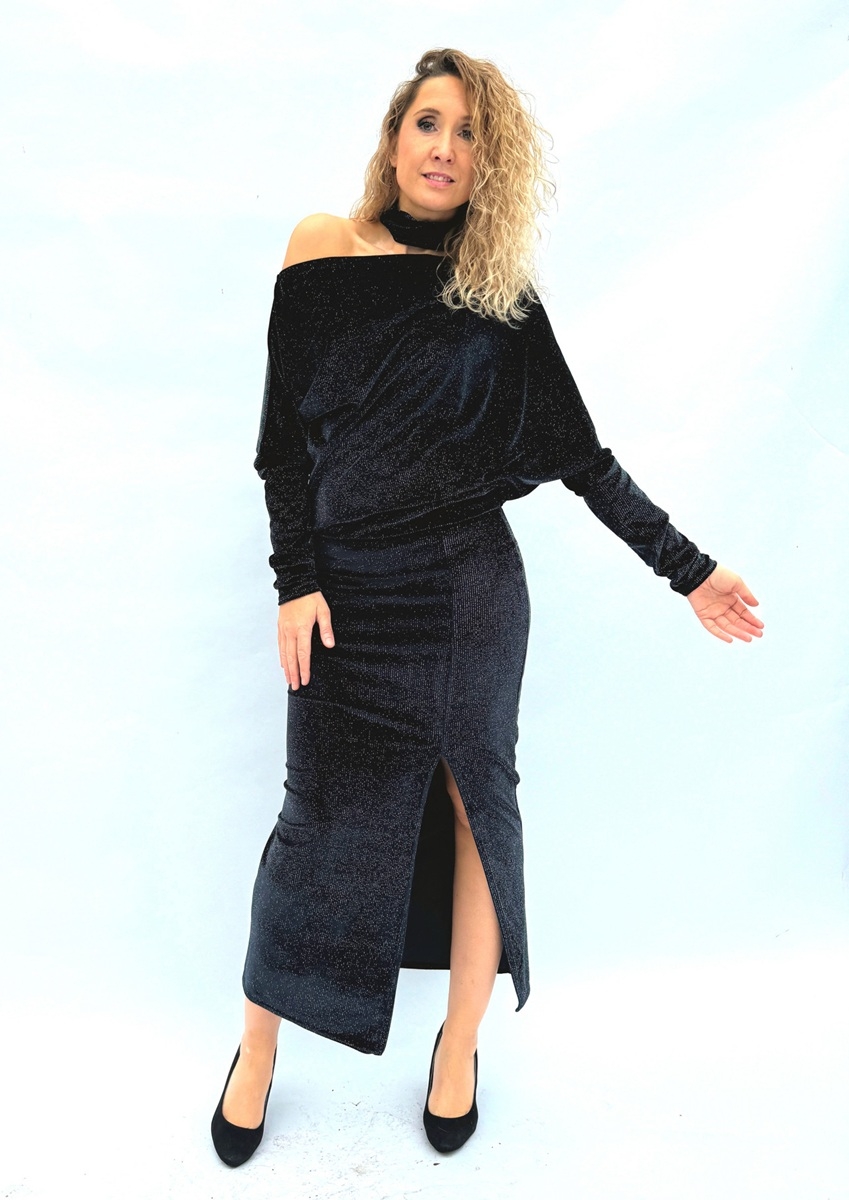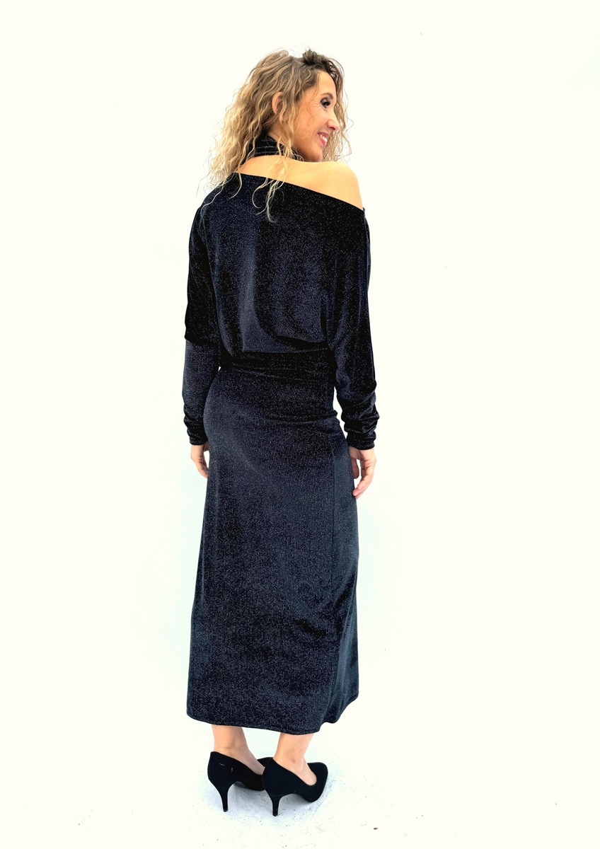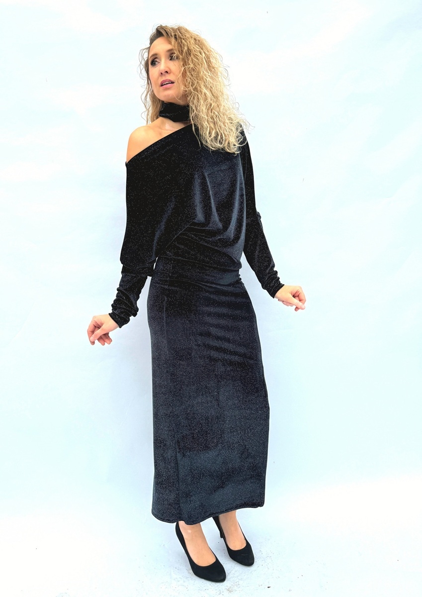 Asymetrické šaty jsou ušité ze syntetického sametu se třpytem.