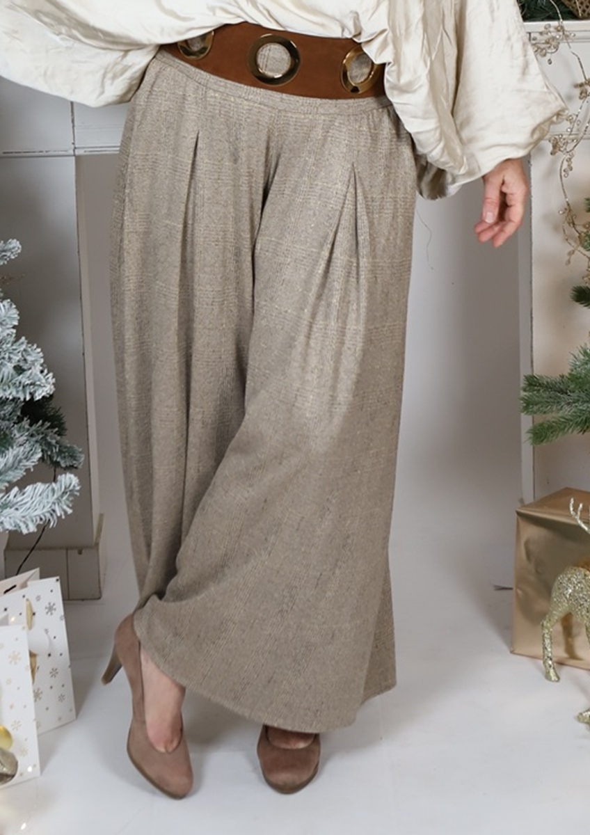 Kalhoty jsou ušité ušité z příjemného úpletu s glenčekovou kostičkou a zlatou nitkou. V bočních švech jsou kapsy. Pásek je pružný, vyztužený proti vytažení.