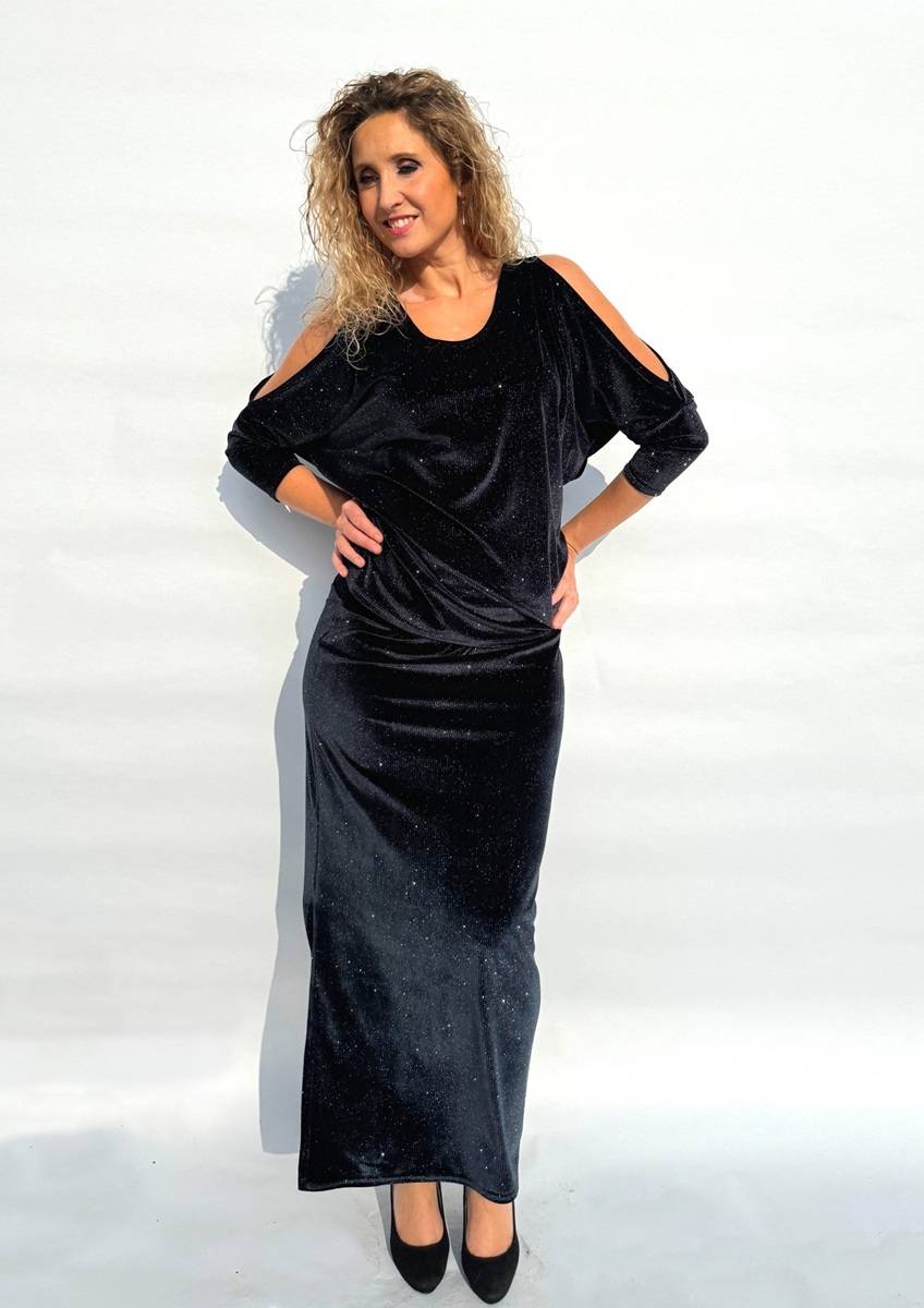 Dlouhá pouzdrová sukně je ušitá ze syntetického pružného sametu. V pase je pružný pruh vyztužený proti vytažení.