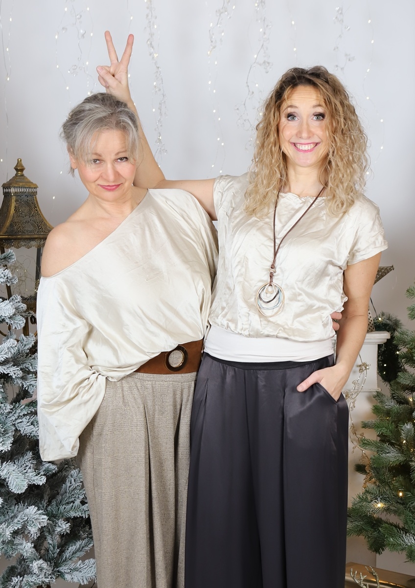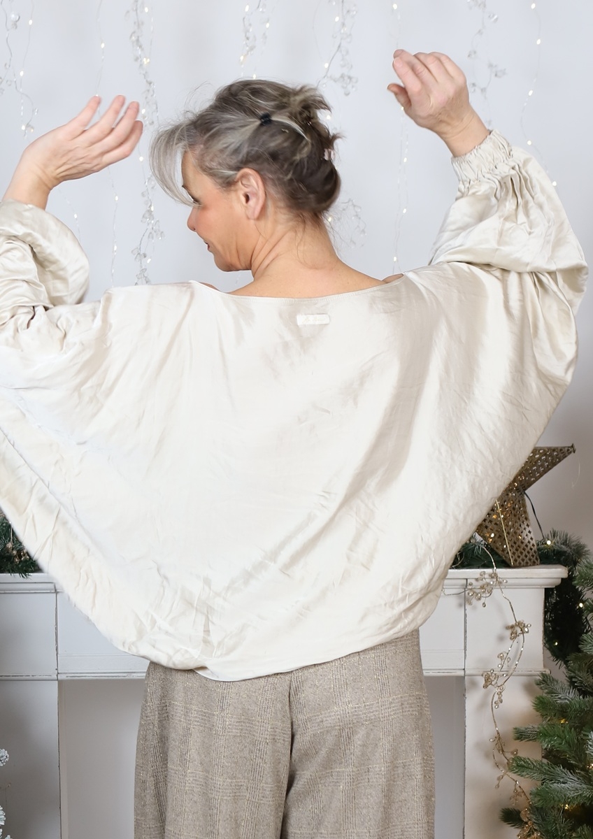 Volná tunika s lodičkovým výstřihem je ušitá z oboustranného pružného saténu vyšší gramáže.