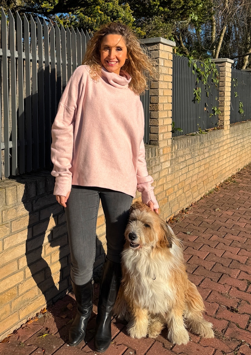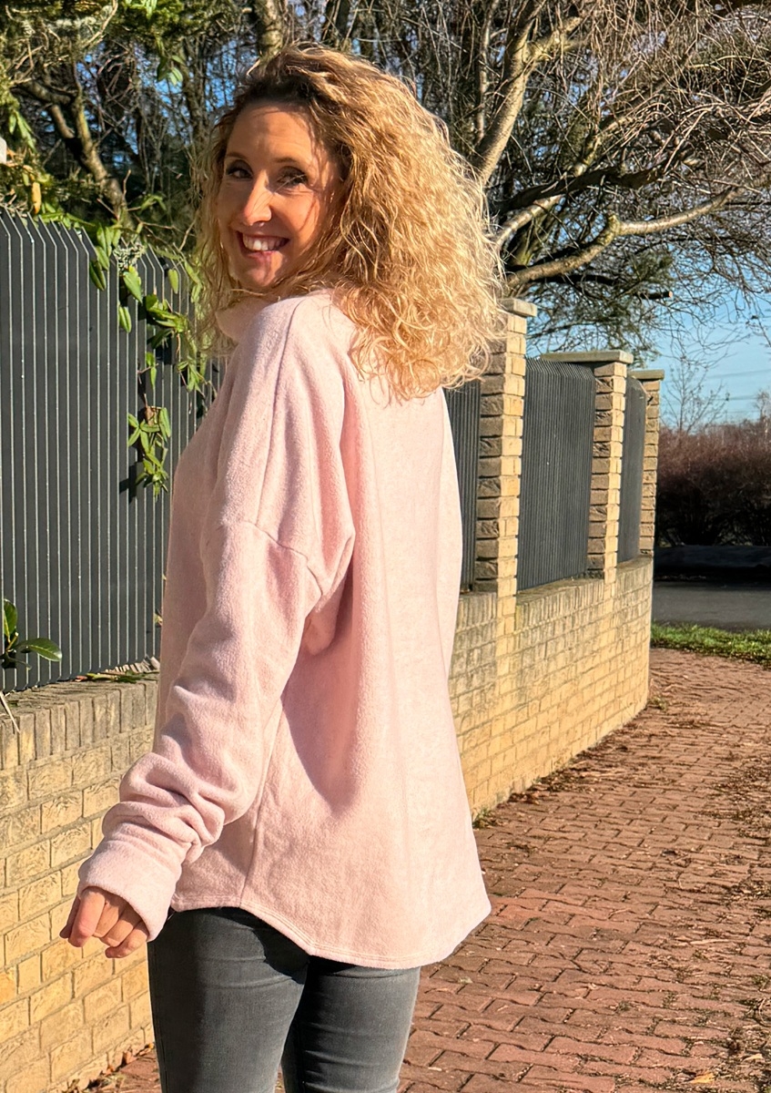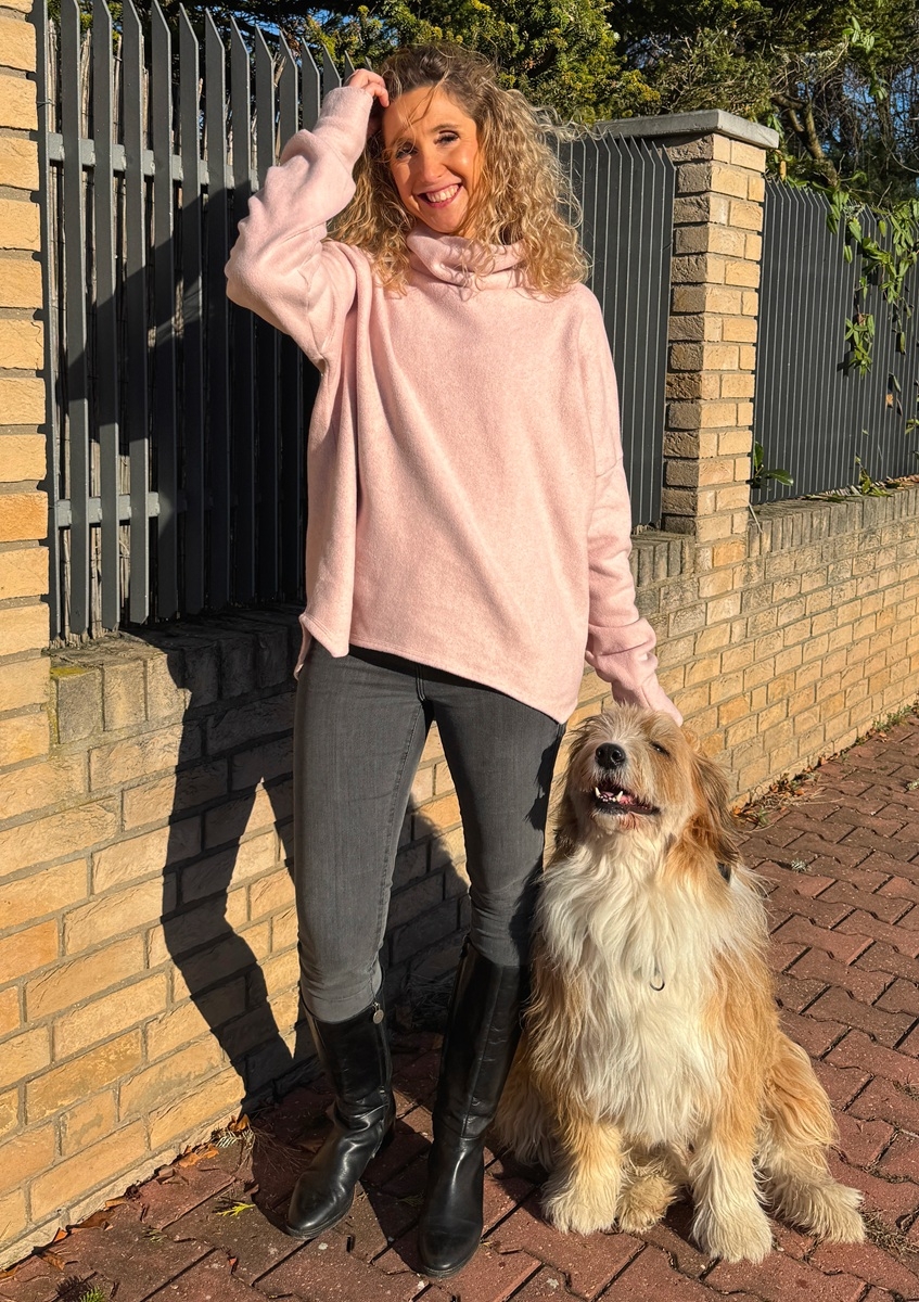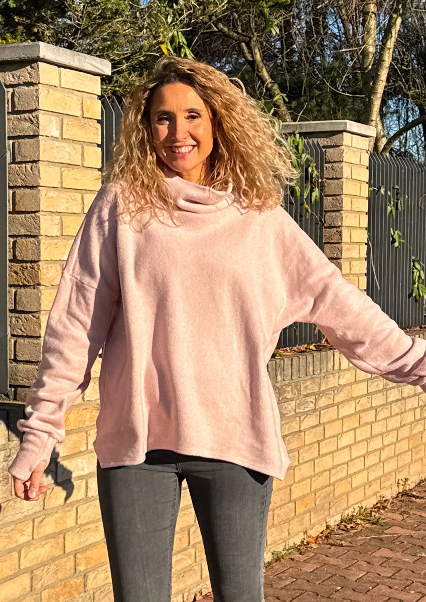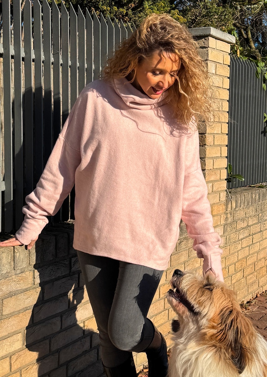 Volná mikina s rolákem a všitými nátepníky je ušitá z fleecové hřejivé 100% bavlny.