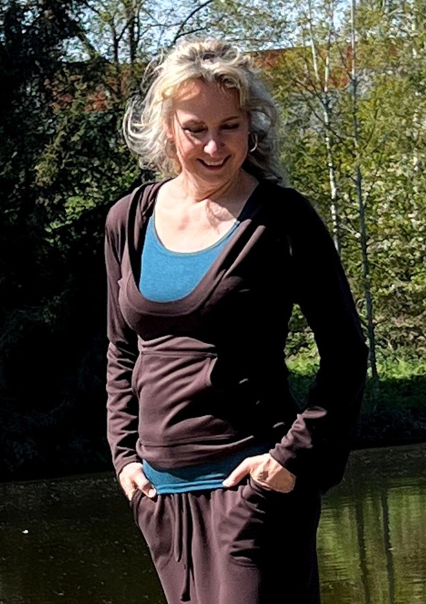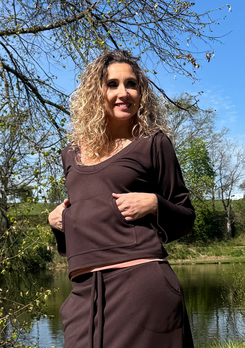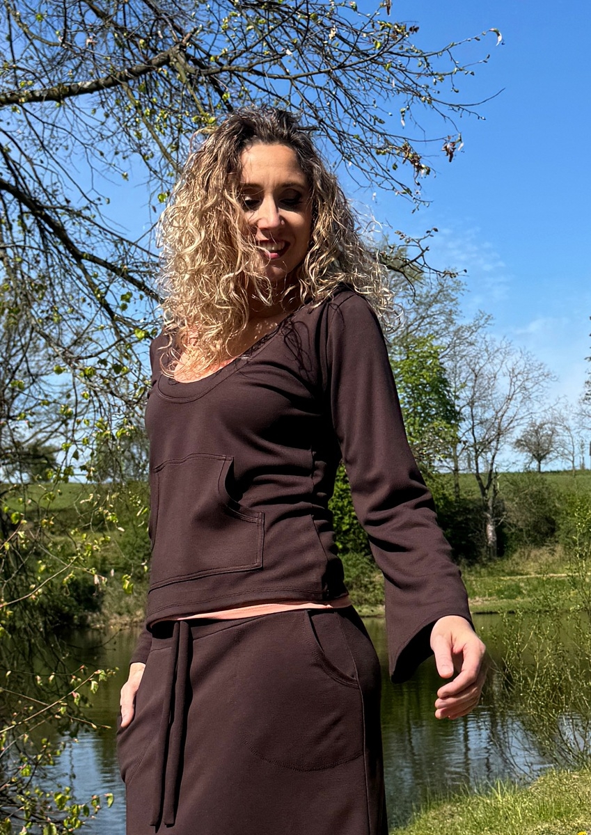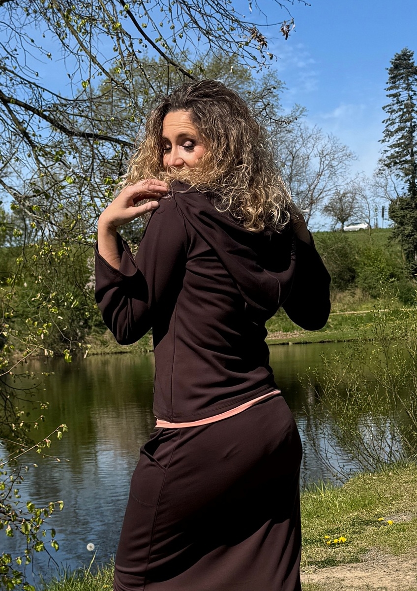 Tenká mikina s širokým rukávy, kapucí a velkým výstřihem je ušitá z úpletu viskóza/polyester/elastan. Na předním díle je klokanka. Mikinu můžete nosit jako soupravu se sukní.