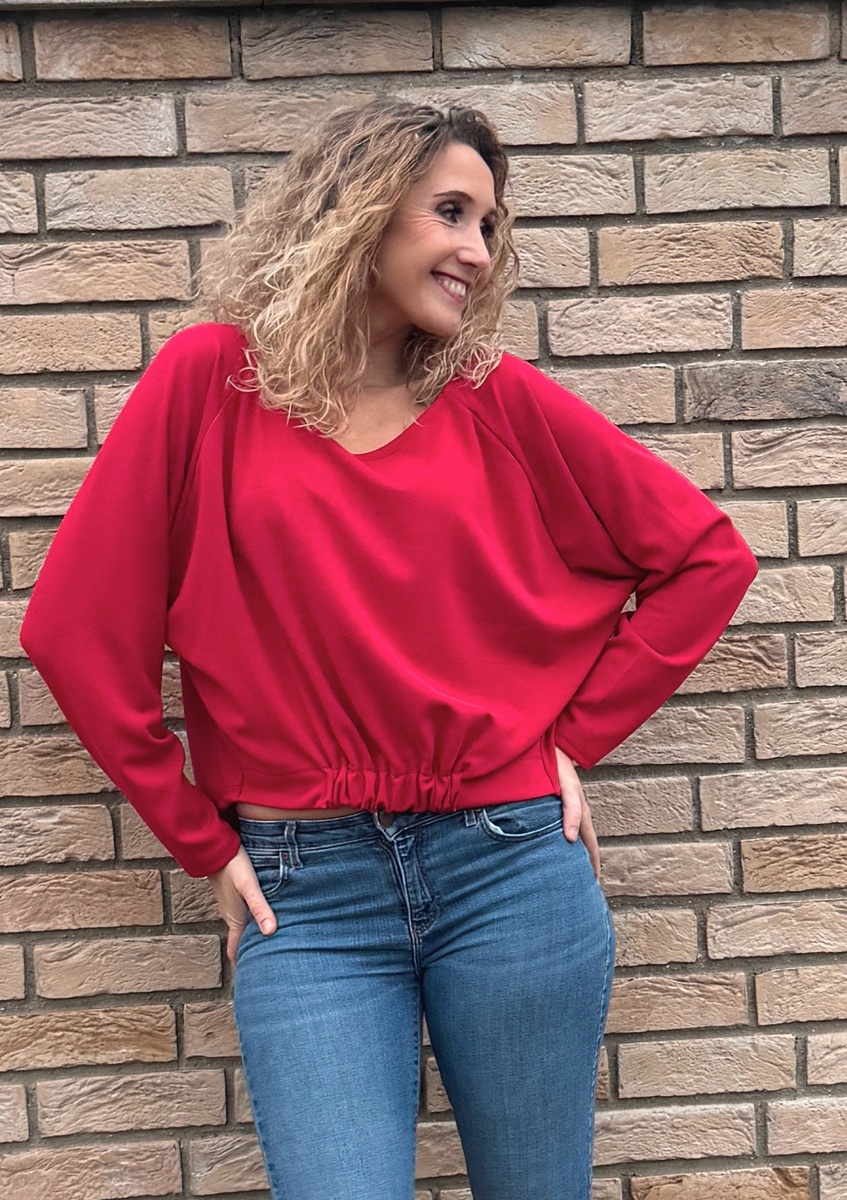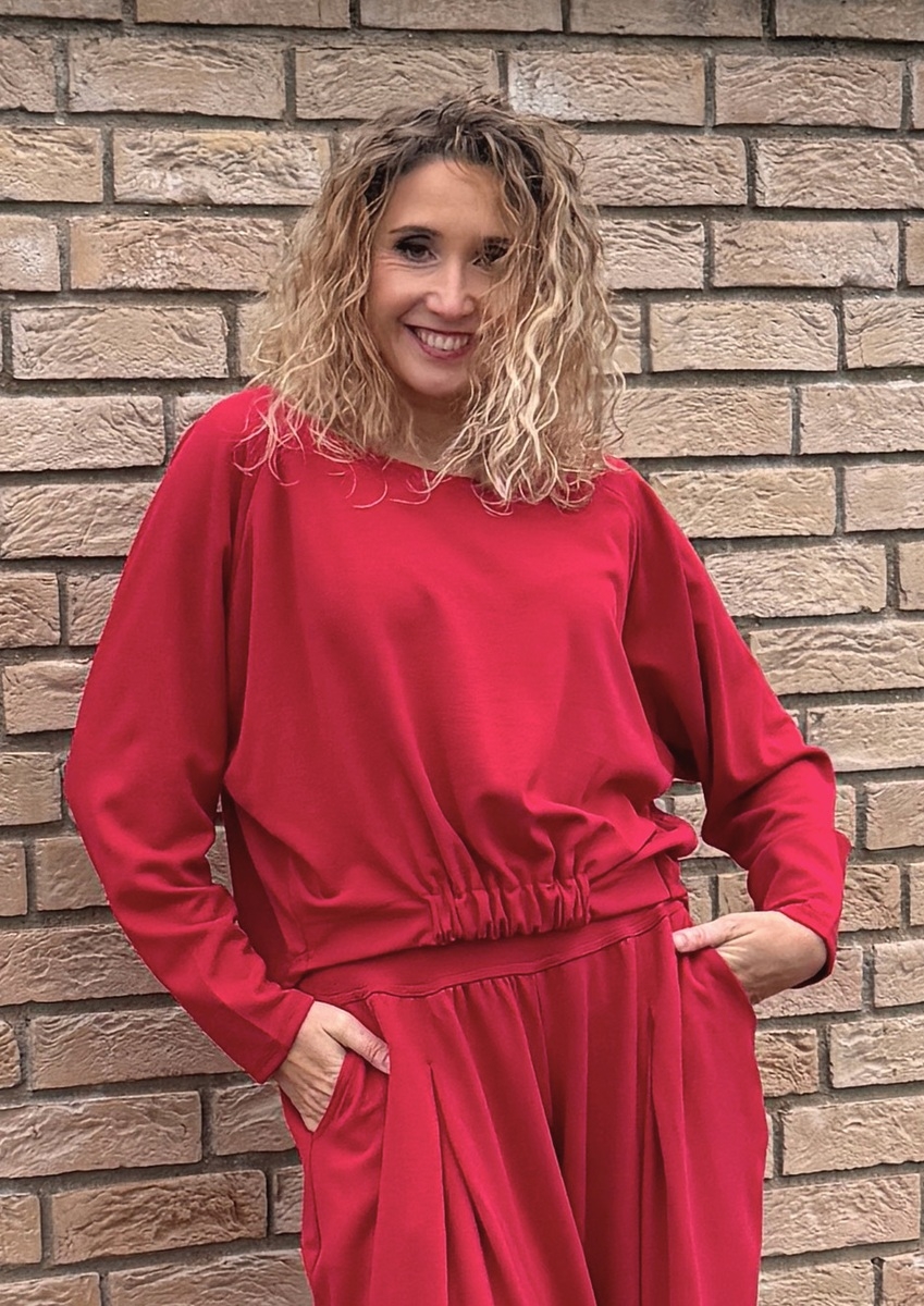 Má dlouhé rukávy se všitými nátepníky. Ne předním díle je v pase zdobený nařasením do široké gumy. Délka se mírně svažuje dozadu.