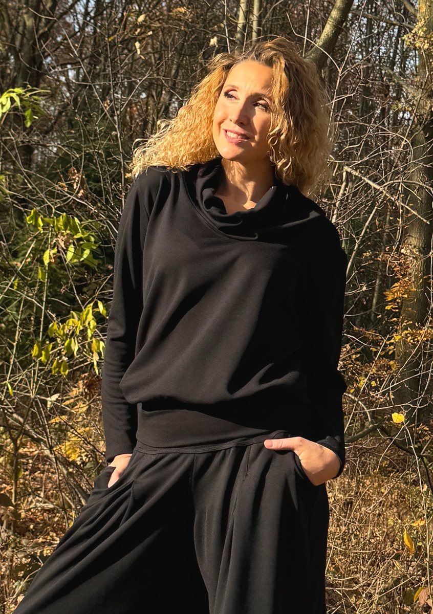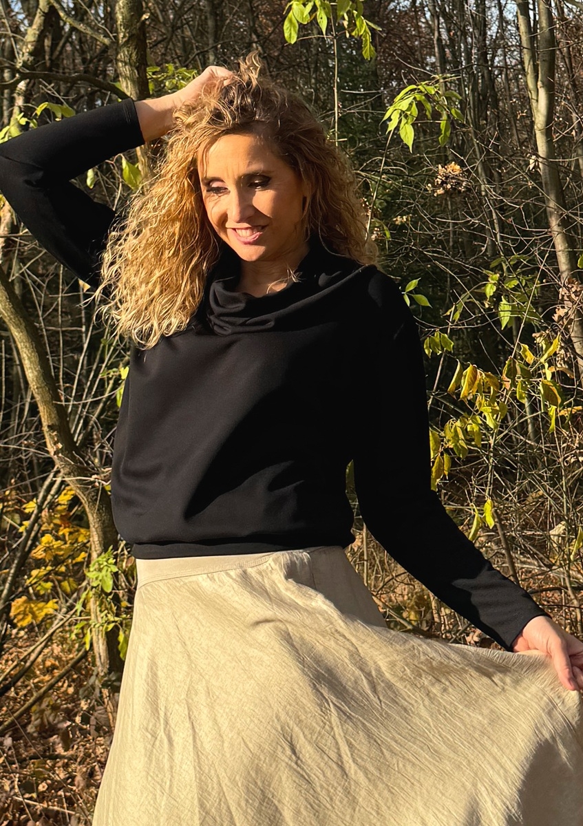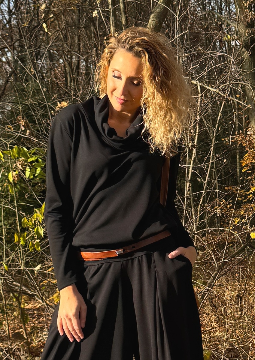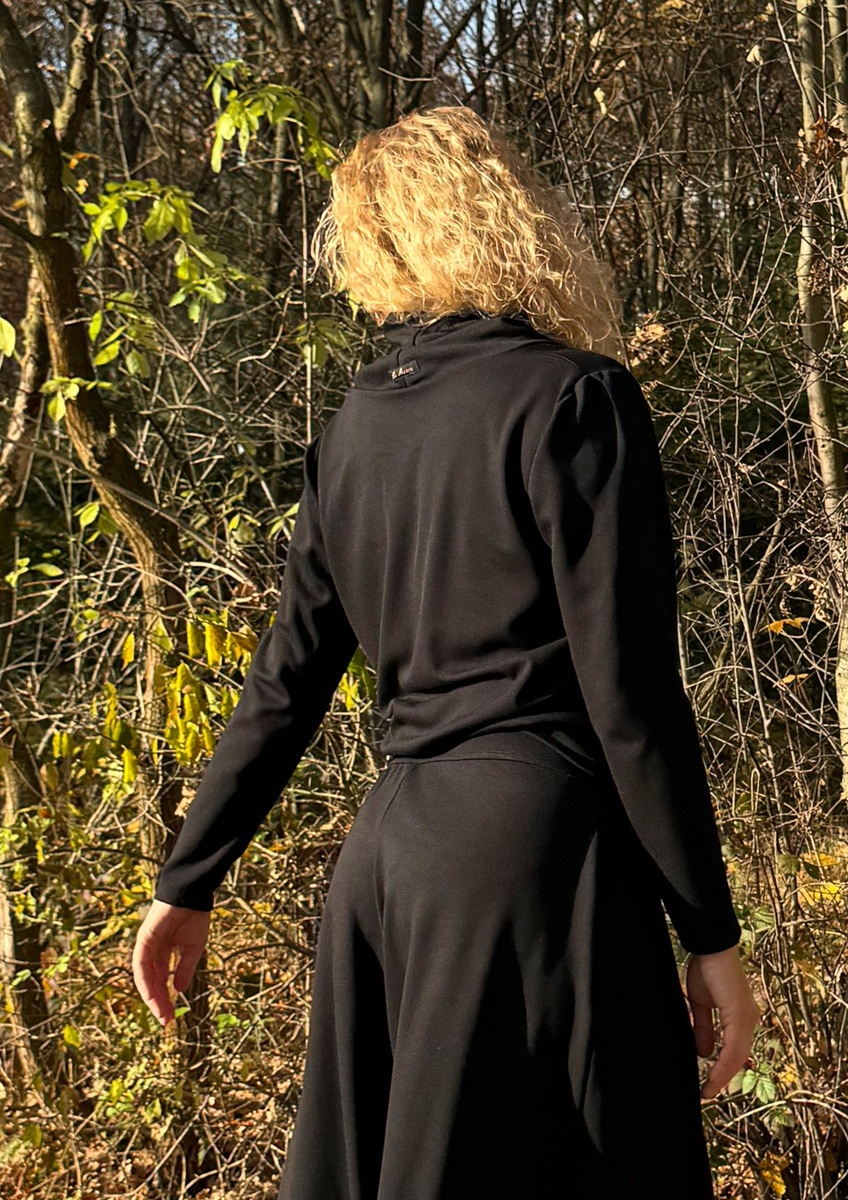 Rolák s dlouhým rukávem je ušitý ze středně silného  směsového úpletu (68%vis/28%Pes/4%ela). Spodní díl je stažený do širokého pružného  pasu.