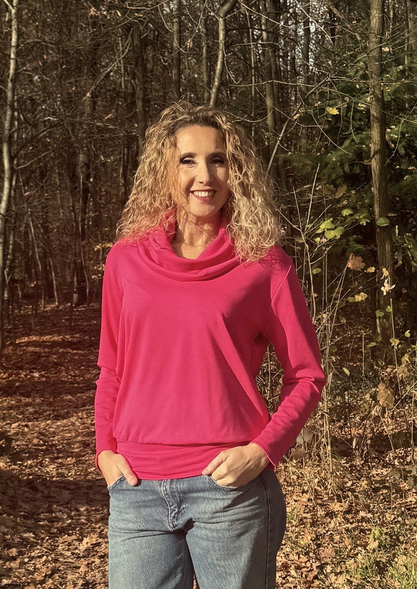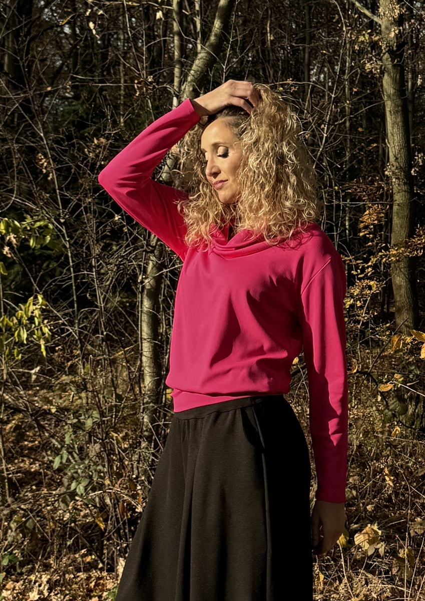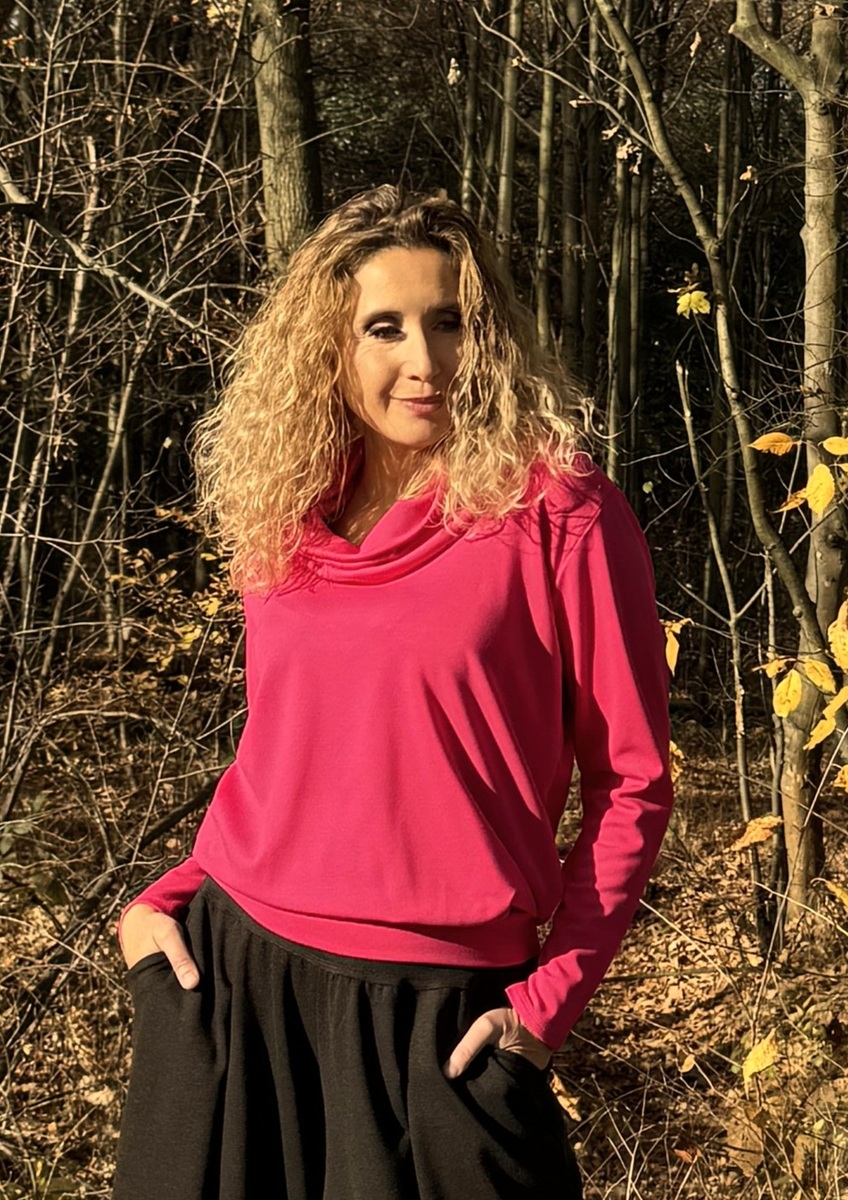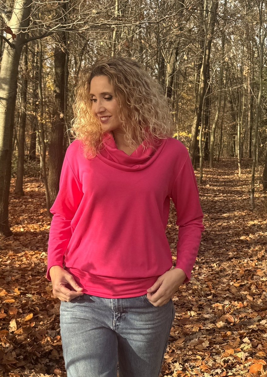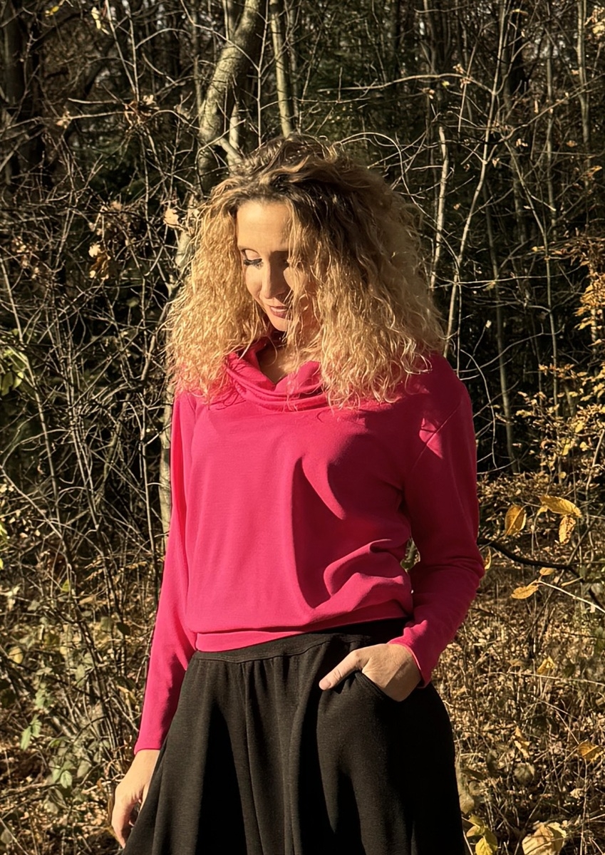 Rolák s dlouhým rukávem je ušitý ze středně silného  směsového úpletu (68%vis/28%Pes/4%ela). Spodní díl je stažený do širokého pružného  pasu.