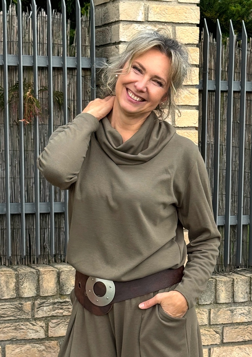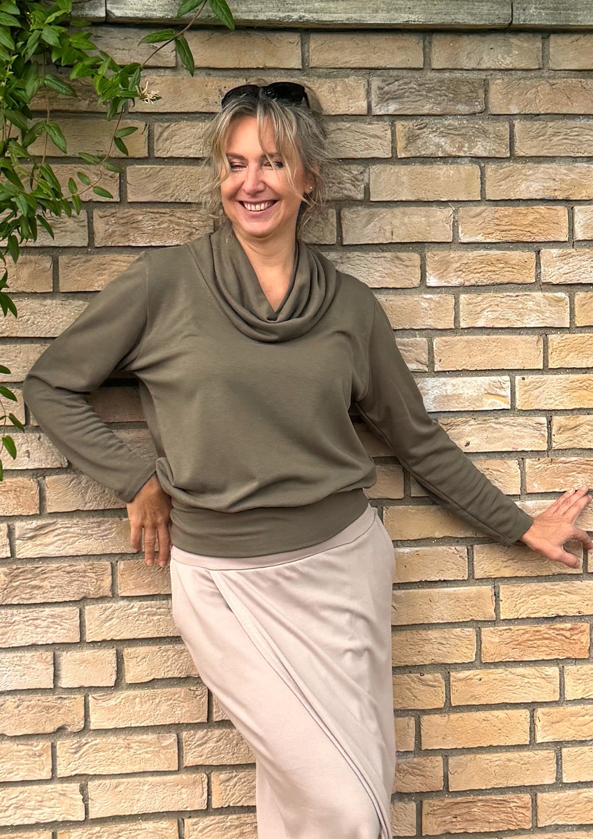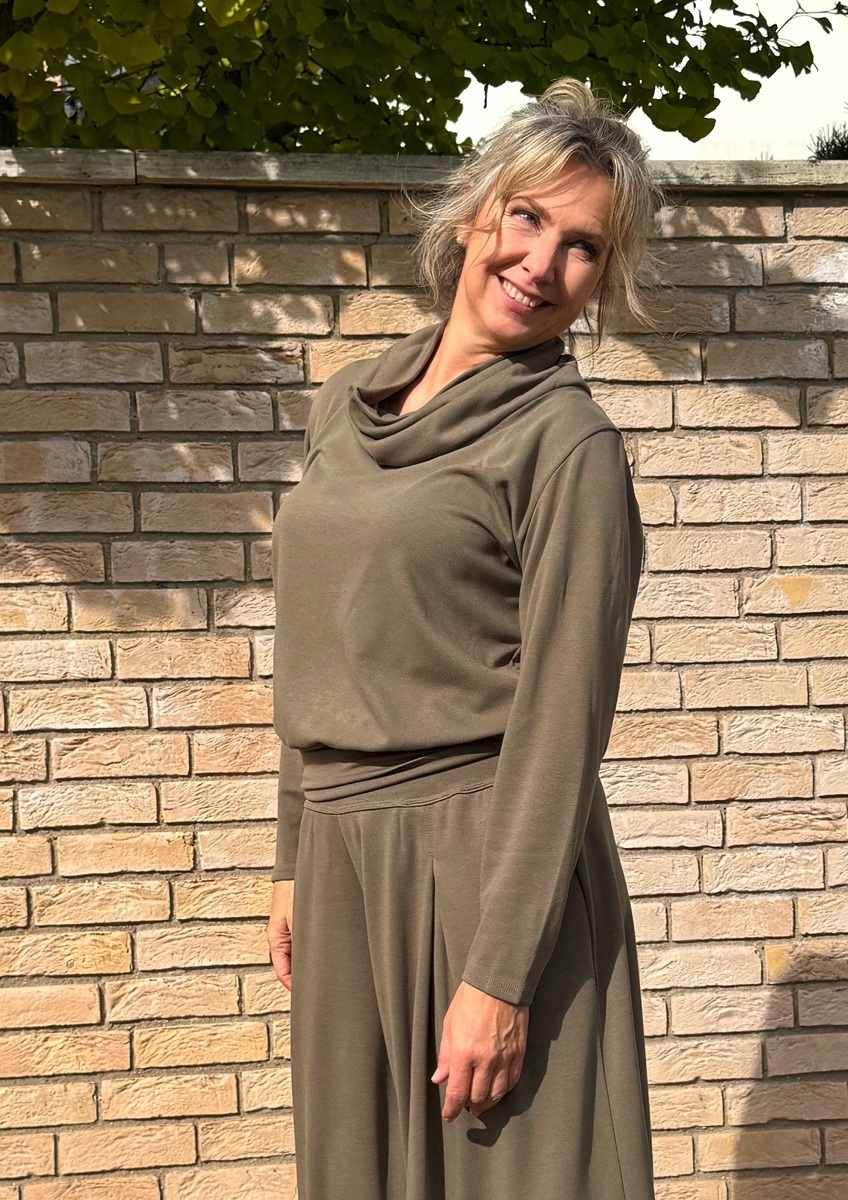 Rolák s dlouhým rukávem je ušitý ze středně silného  směsového úpletu (68%vis/28%Pes/4%ela). Spodní díl je stažený do širokého pružného  pasu.