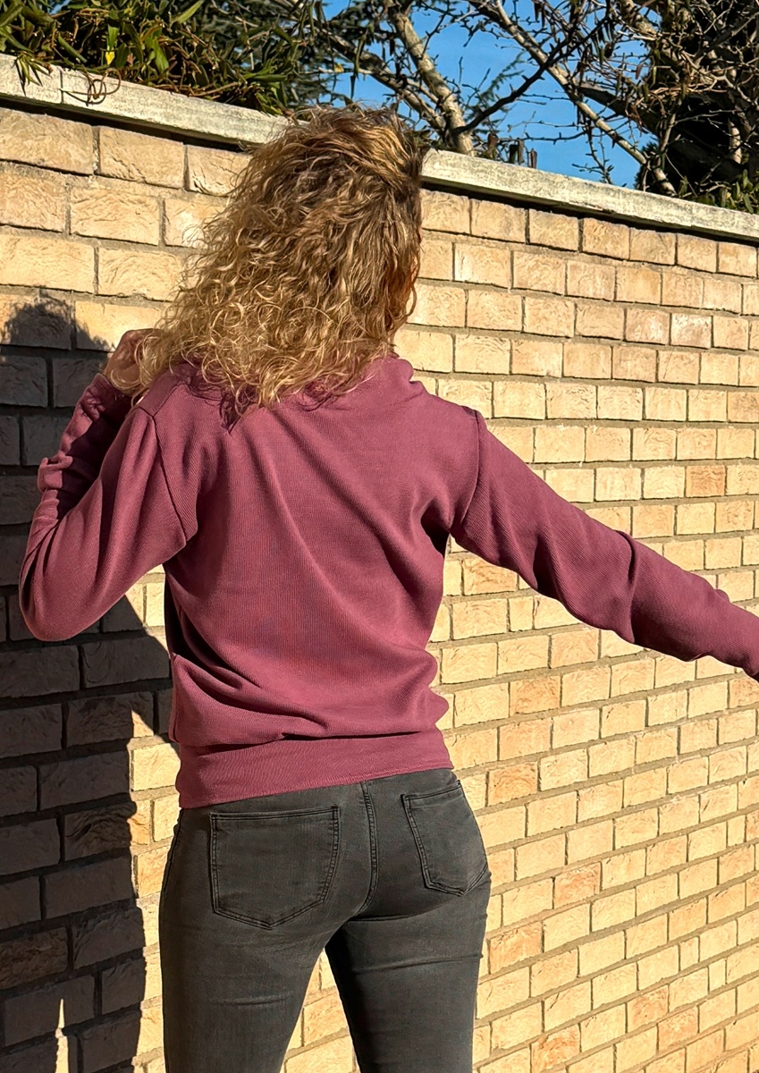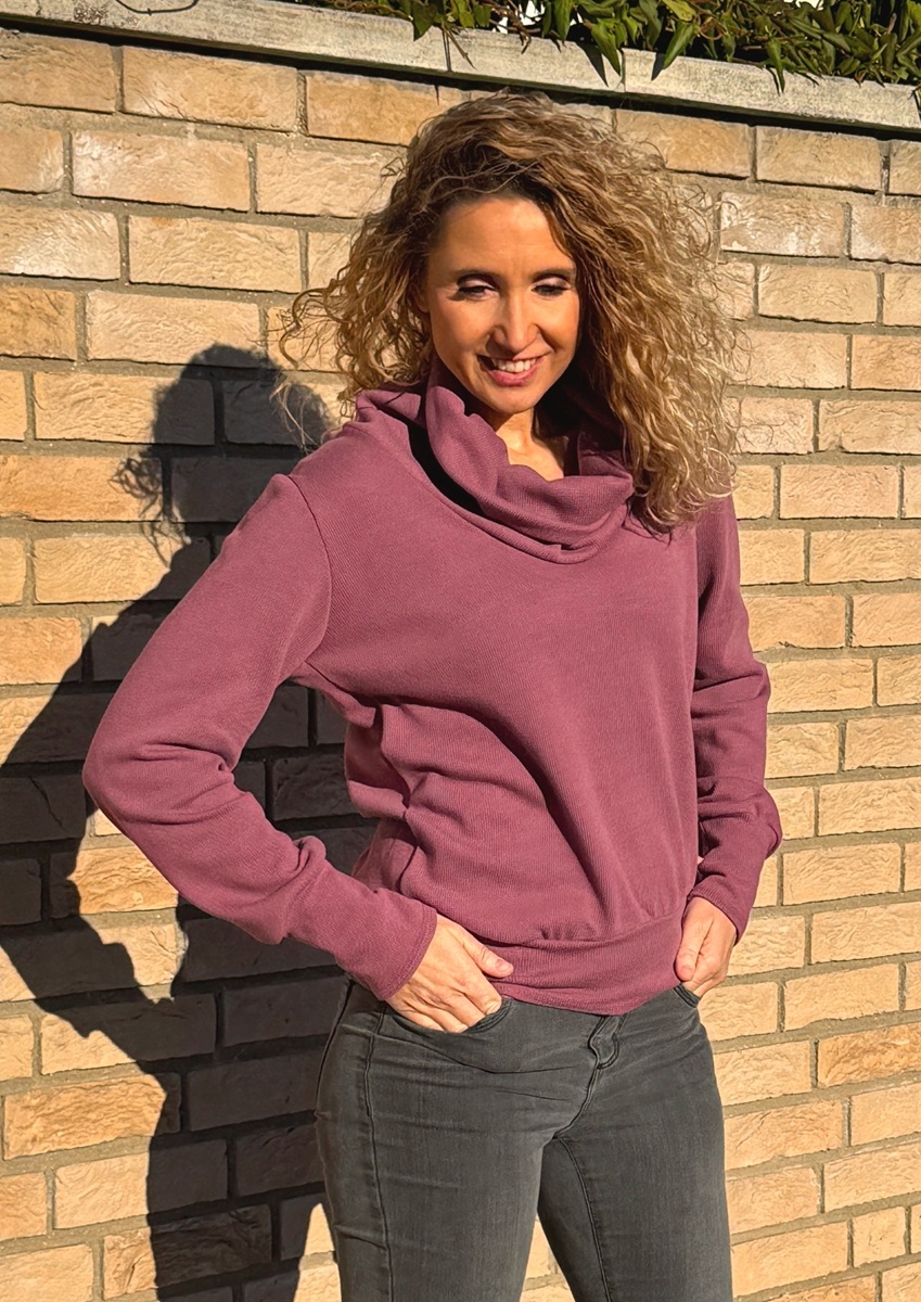 Rolák s dlouhým rukávem je ušitý z bavlněného svetrového úpletu. V pase je stažený do širokého lemu.