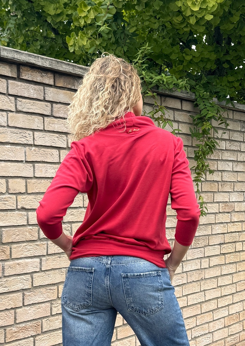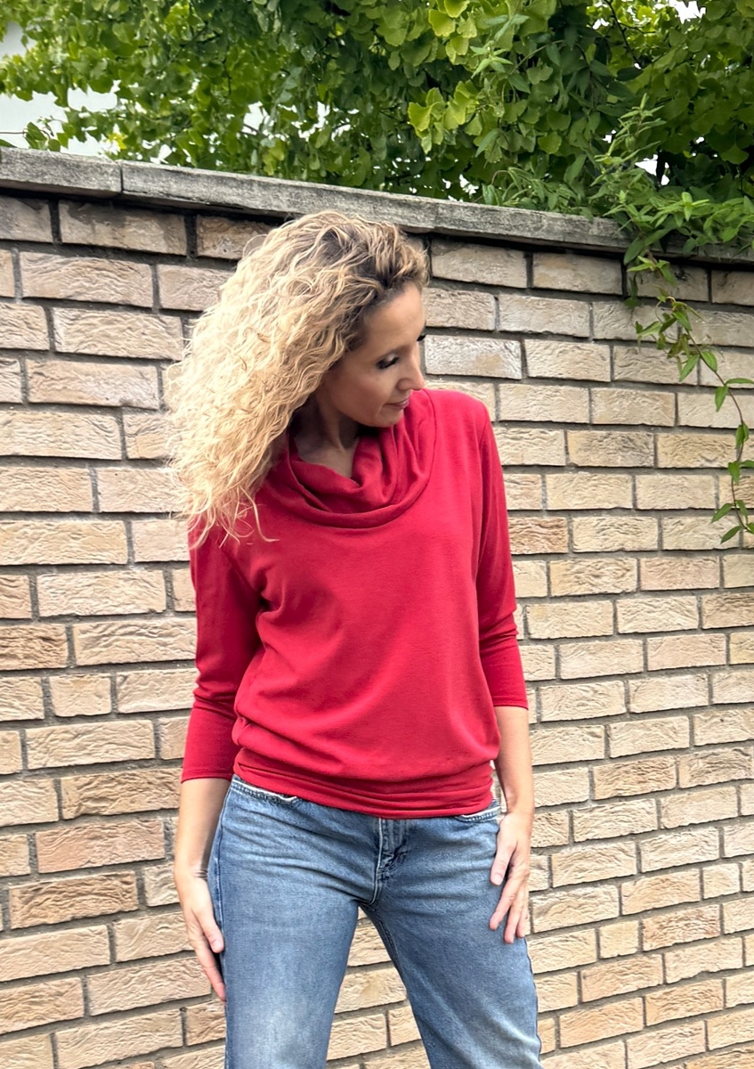 Rolák s 3/4 rukávem je ušitý ze středně silného  směsového úpletu (68%vis/28%Pes/4%ela). V pase je stažený do širokého lemu.