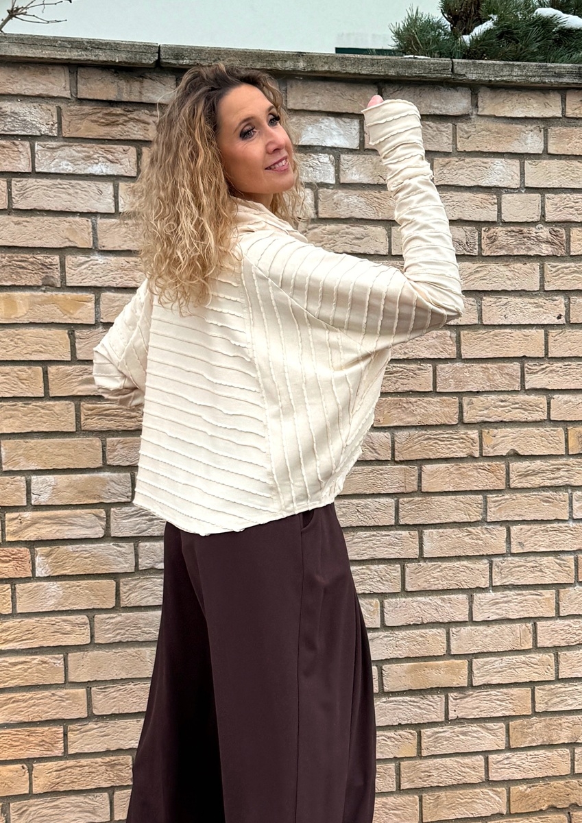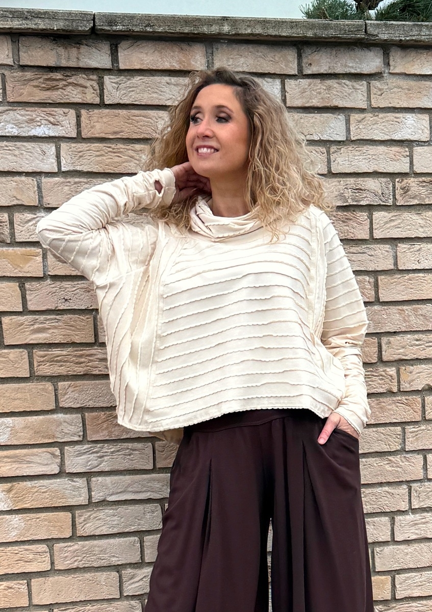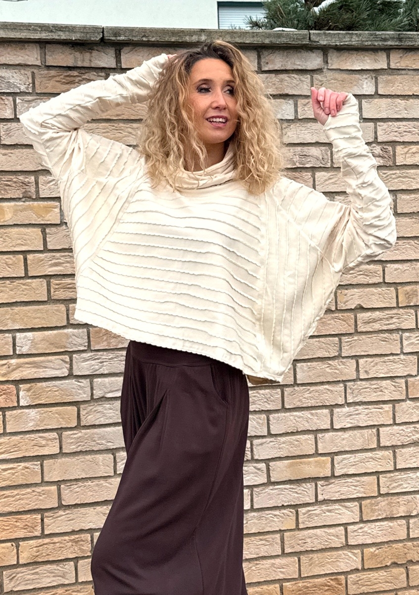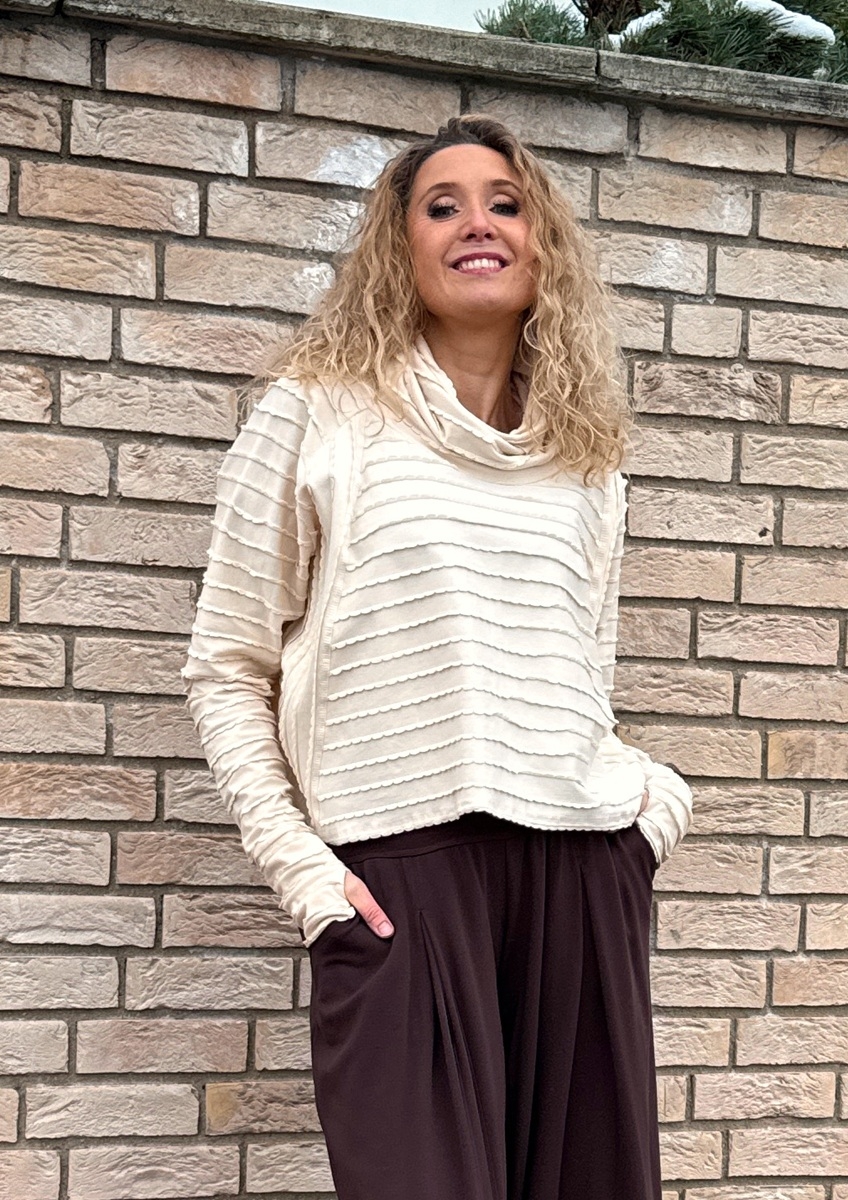 Volný rolák je z pružného úpletu (95%Bavlna /5%elastan) s plastickým vzorem. Rukávy jsou prodloužené s otvory na palce)
