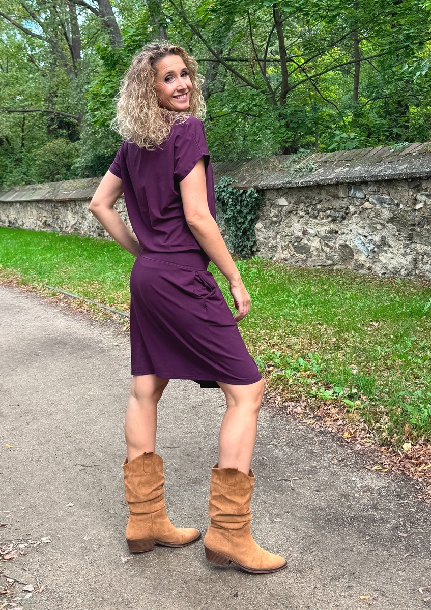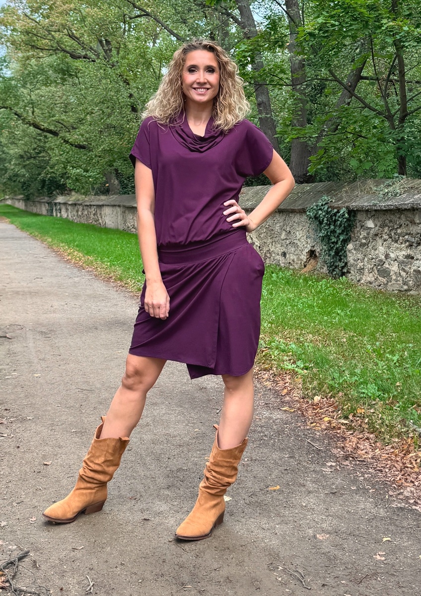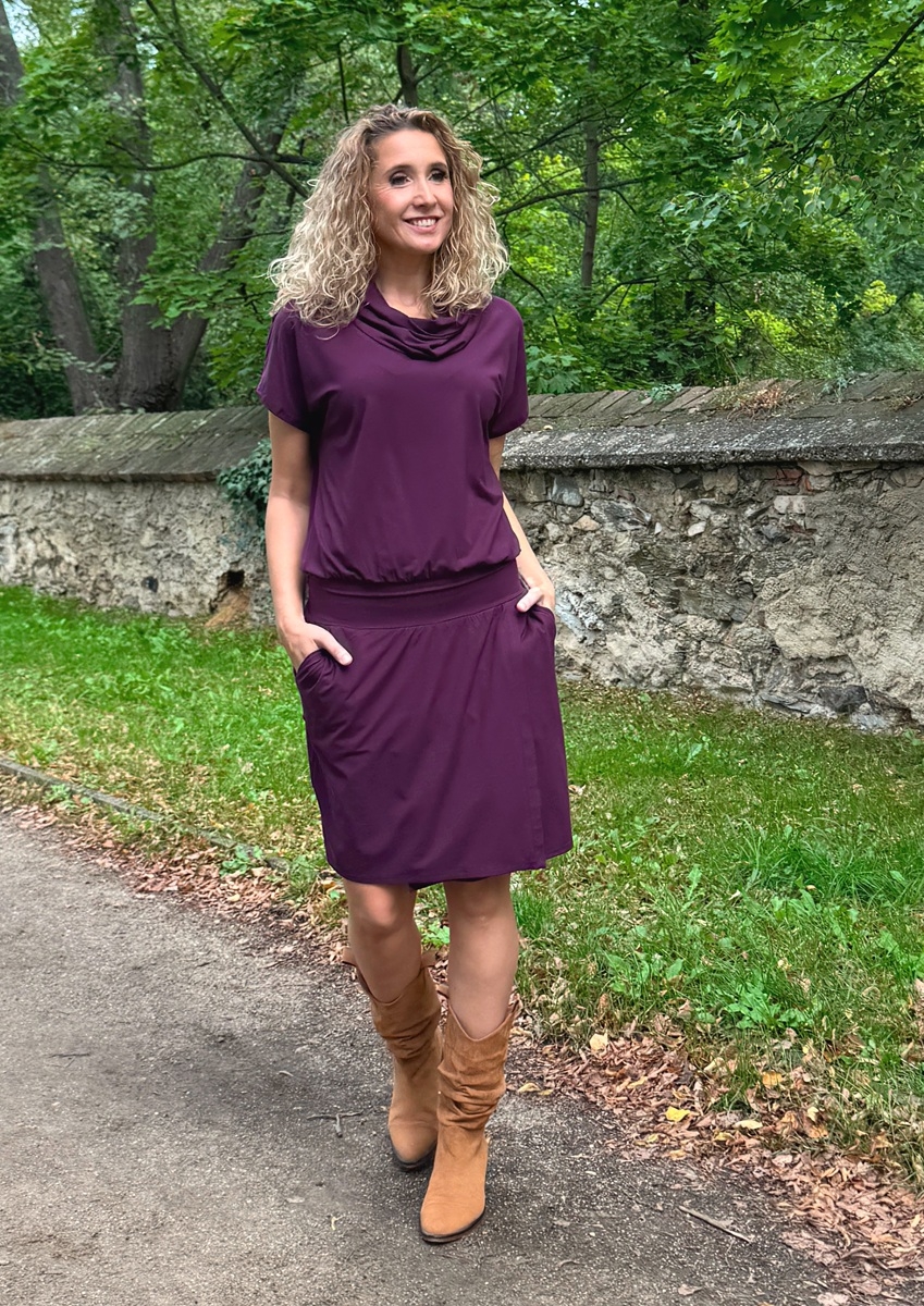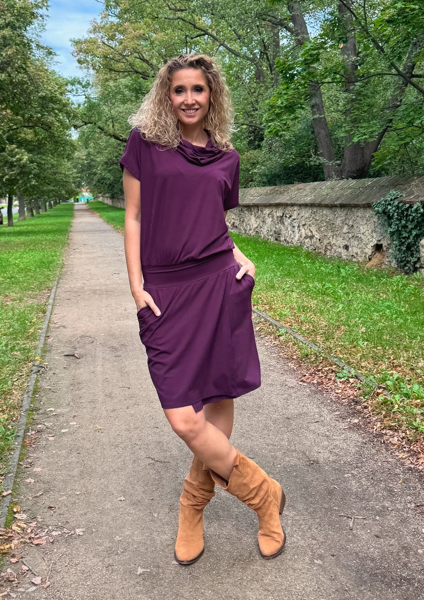 Fialové šaty krátké s rozparkem