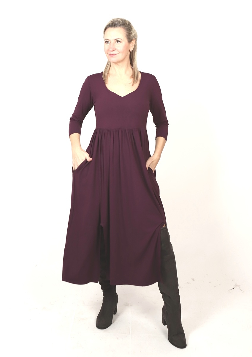 Šaty jsou ušité z úpletu viskóza/elastan. Mají dlouhou rozevlátou sukni a dva rozparky.  Výstřih do tvaru srdce. V horní části jsou přiléhavé a pod prsy se rozvoňují do široké sukně sukně s nepravidelnou délkou.