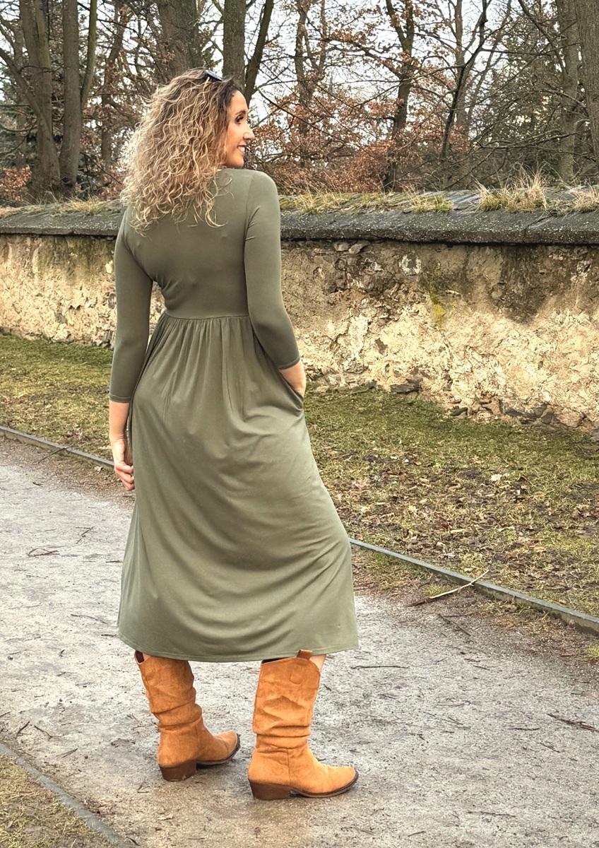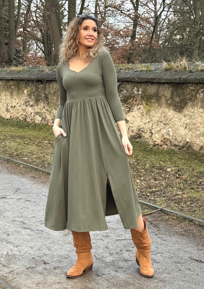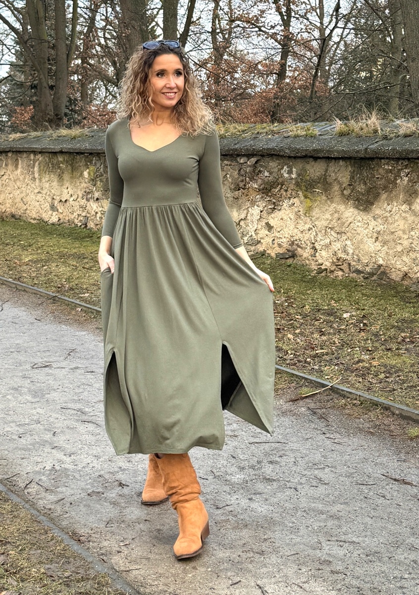 Šaty jsou ušité z úpletu viskóza/elastan. Mají dlouhou rozevlátou sukni a dva rozparky.  Výstřih do tvaru srdce. V horní části jsou přiléhavé a pod prsy se rozvoňují do široké sukně sukně s nepravidelnou délkou.