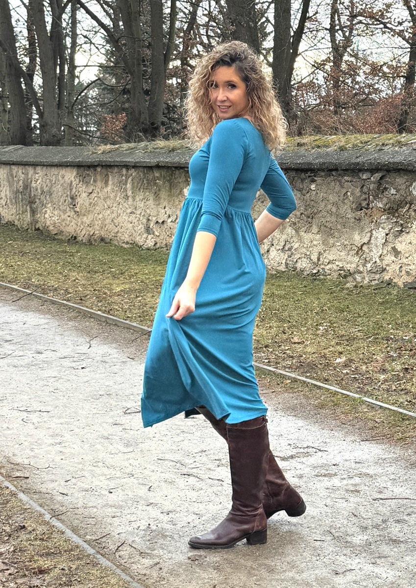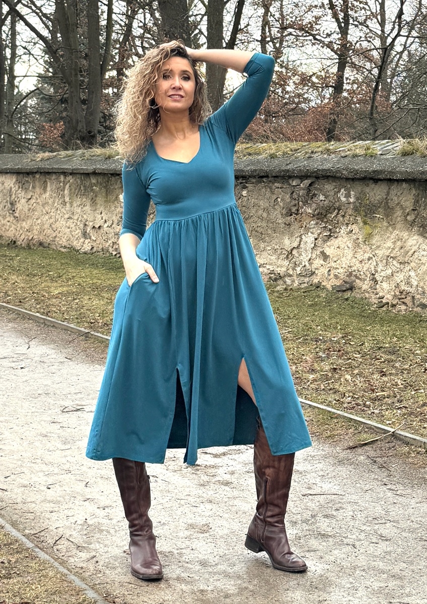 Šaty jsou ušité z úpletu viskóza/elastan. Mají dlouhou rozevlátou sukni a dva rozparky.  Výstřih do tvaru srdce. V horní části jsou přiléhavé a pod prsy se rozvoňují do široké sukně sukně s nepravidelnou délkou.
