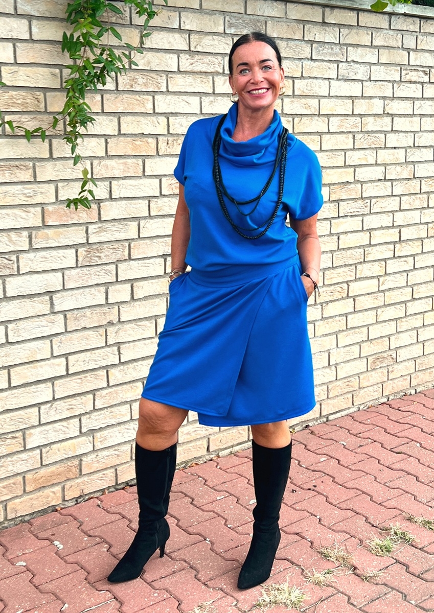 Šaty mají navolněný roláček. Sukně je zavinutá a všitá do pružného pásku. V bočních švech jsou kapsy.