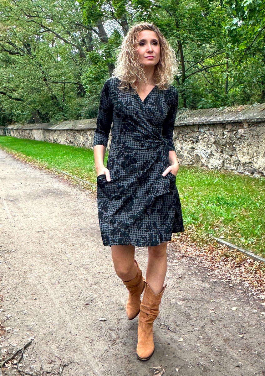 Zavinovací šaty se zvonovou sukní jsou ušité z pružného úpletu viskóza/polyester/lelastan. Na sukni jsou boční kapsy, 3/4 rukáv.