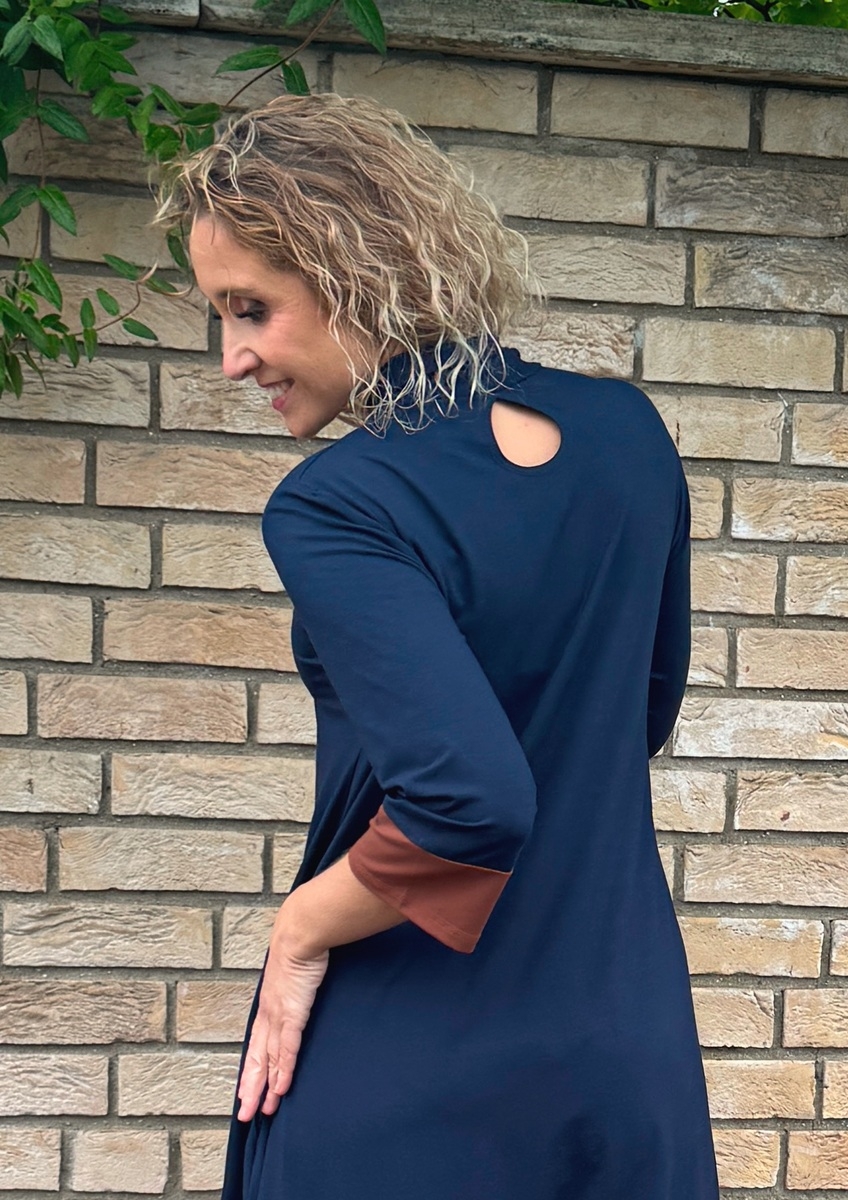 Střih je pohodlný, sukně je rozšířená do zvonu. Šaty mají na zádech ozdobnou slzu. V bočních švech jsou kapsy. Rukáv 3/4 délka