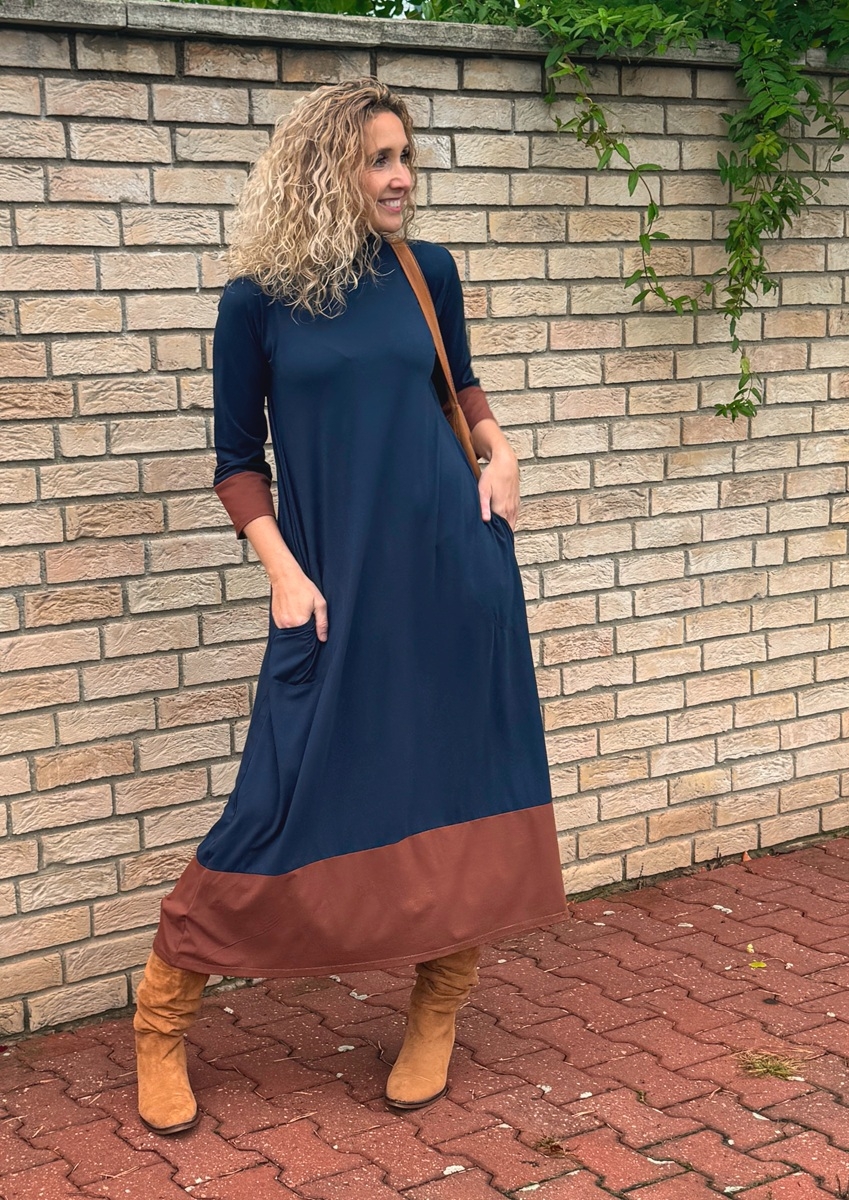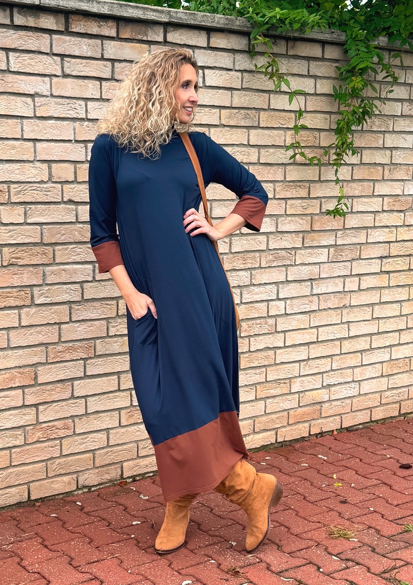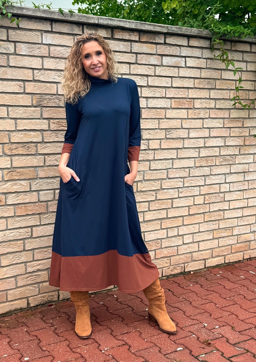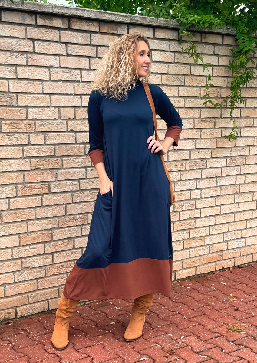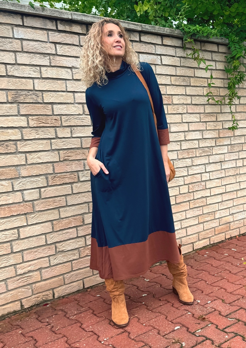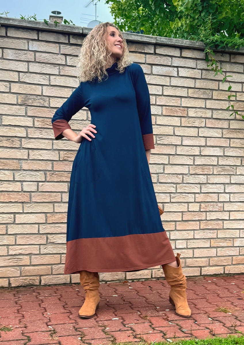 Zvonové šaty modro skořicové dlouhé