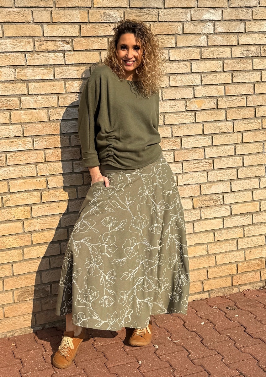 Rozšířená sukně je ušitá ze směsového materiálu (viskóza, len) s vyšívanými květy. Pásek je vyztužený proti vytažení. V bočních švech jsou kapsy.