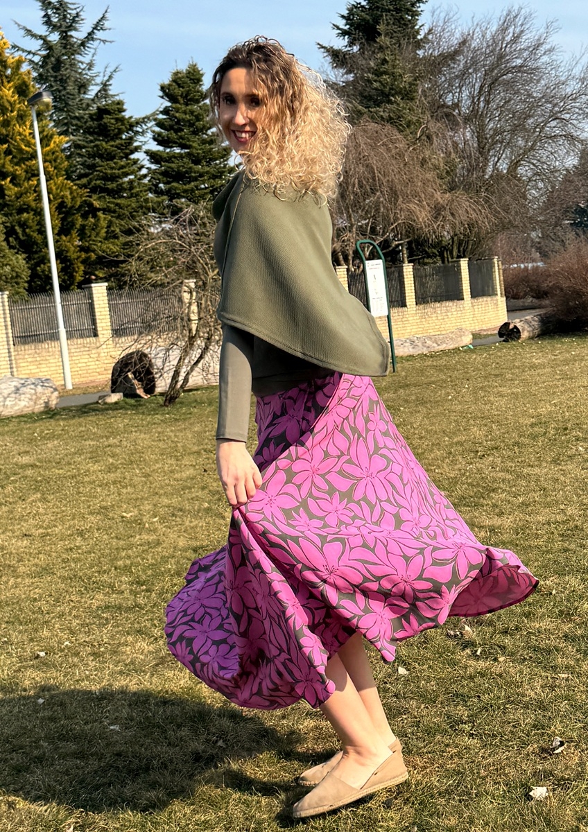 Rozšířená sukně  je ušitá z lehké vzdušné 100% viskózy. Pásek je vyztužený proti vytažení.