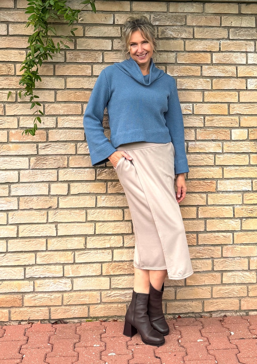 Sukně je ušitá ze směsového středně silného úpletu (68%Vis/28pes/4%ela). Pásek je pružný (vyztužený proti vytažení). Sukně je falešně zavinovací. v bocích jsou vnitřní kapsy.