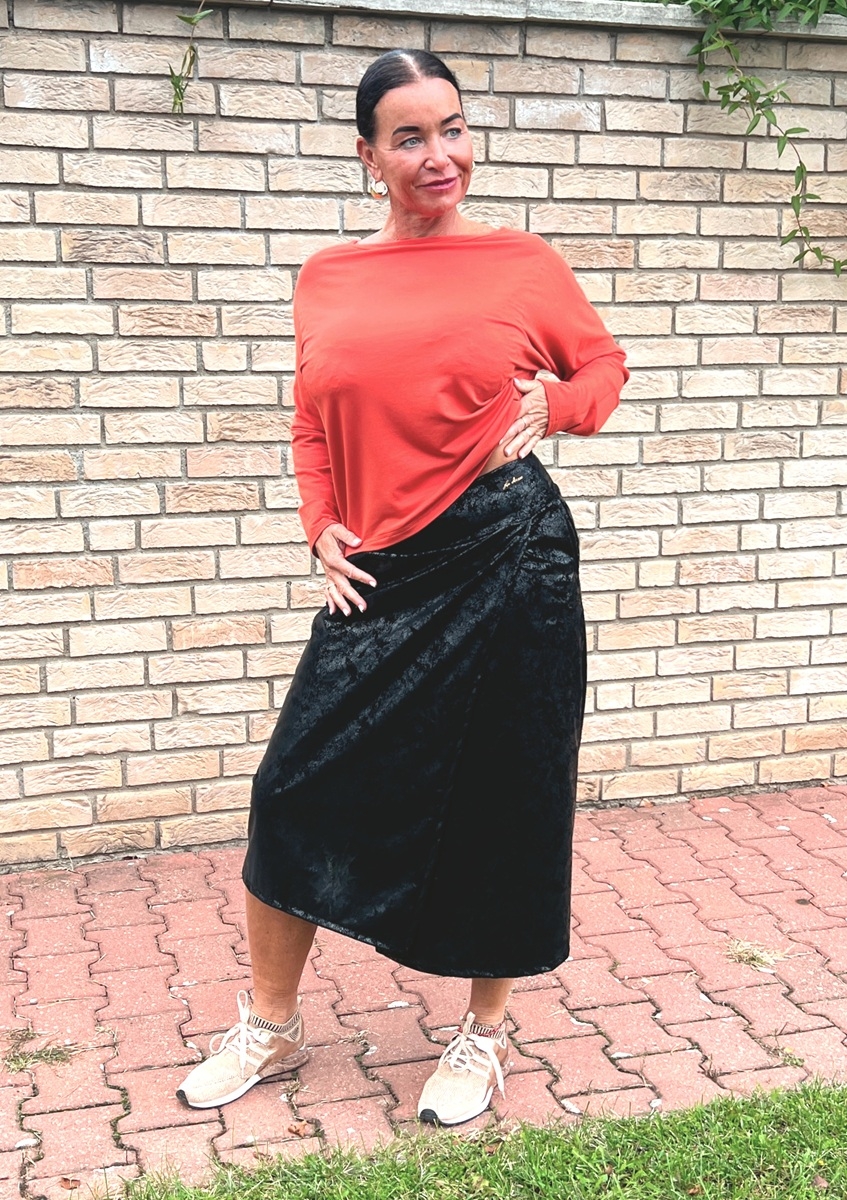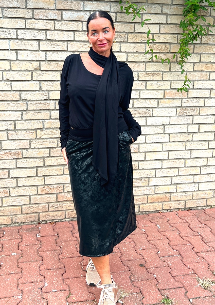 Sukně je ušitá z hřejivého materiálu, který má spodní fleesovou vrstvu a z vnější části budí koženkový efekt. Je tedy ideální i do chladných dnů. Pásek je pružný (vyztužený proti vytažení). Sukně je falešně zavinovací. v bocích jsou vnitřní kapsy.