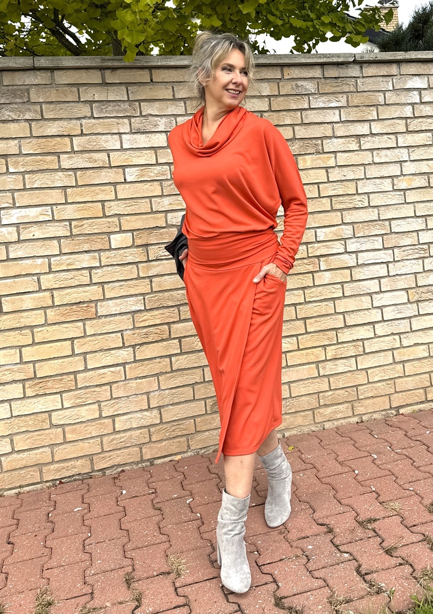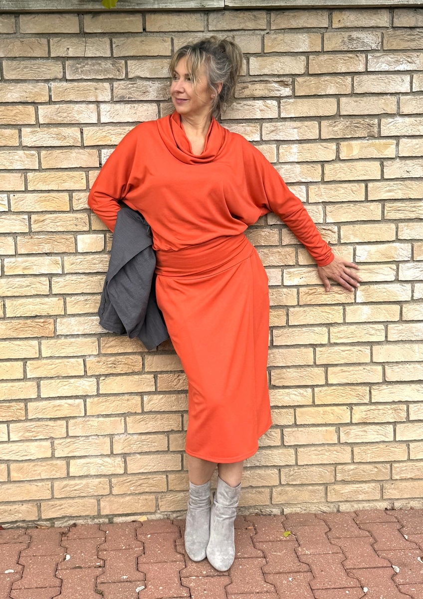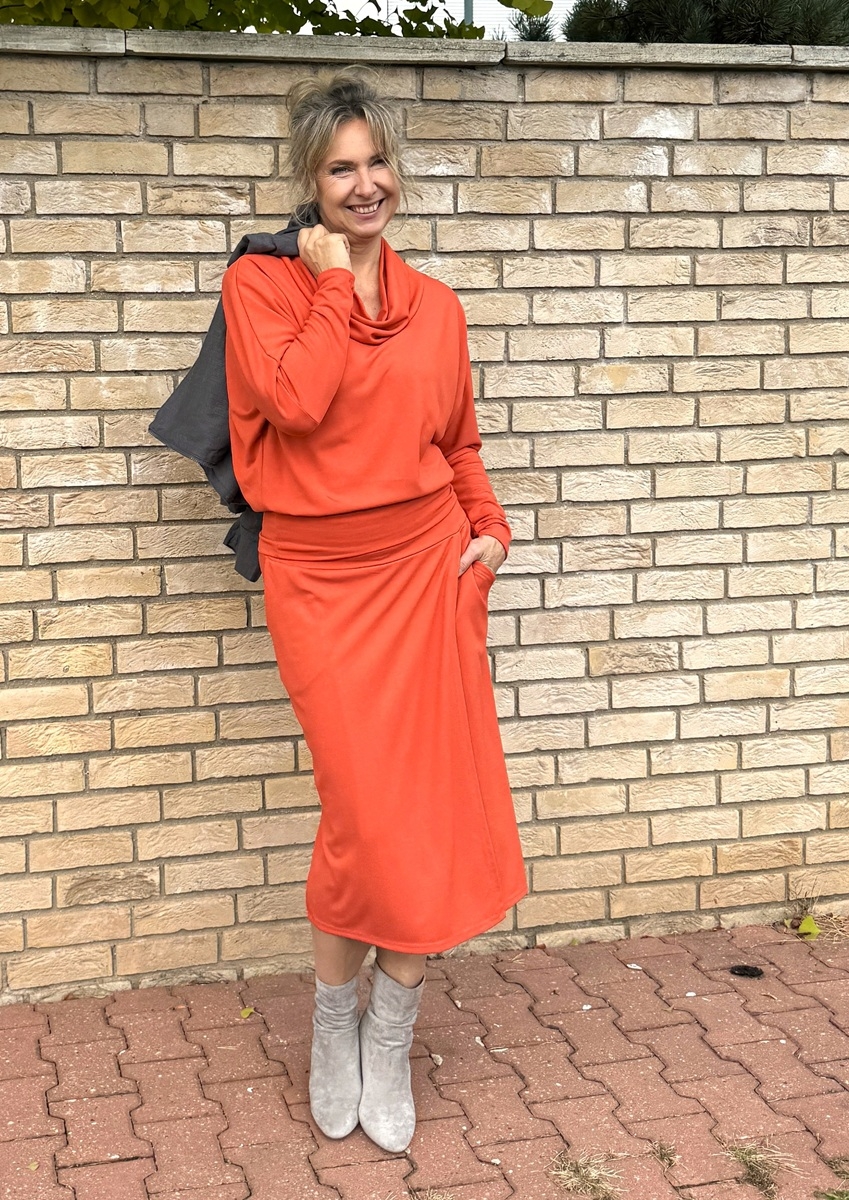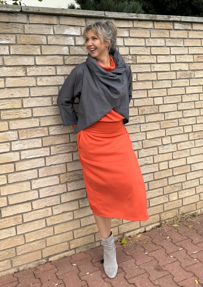 Sukně je ušitá ze směsového středně silného úpletu (68%Vis/28pes/4%ela). Pásek je pružný (vyztužený proti vytažení). Sukně je falešně zavinovací. v bocích jsou vnitřní kapsy.