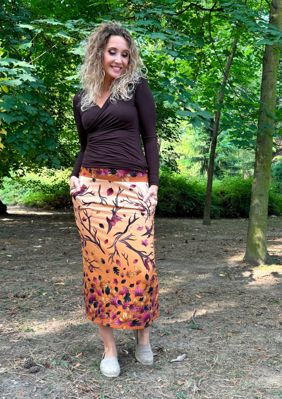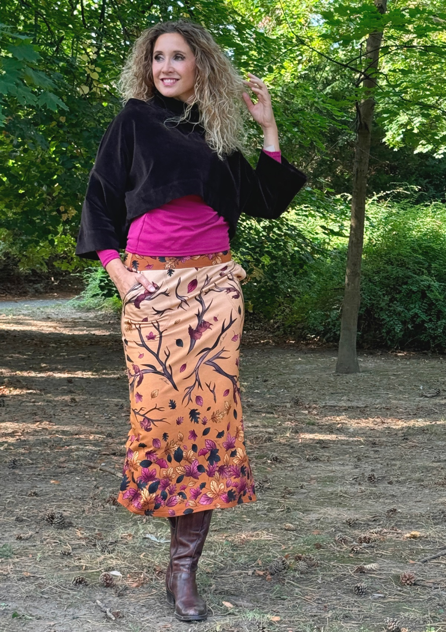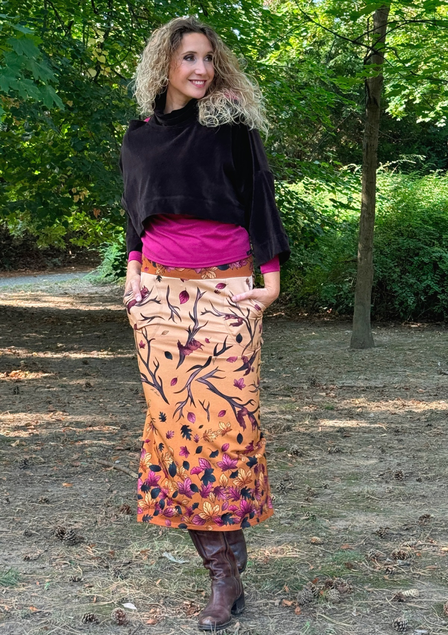 Pohodlná sukně je ušitá z viskźové teplákoviny. V bocích jsou všité kapsy a vzadu malý rozparek.
