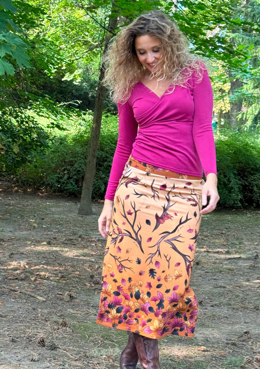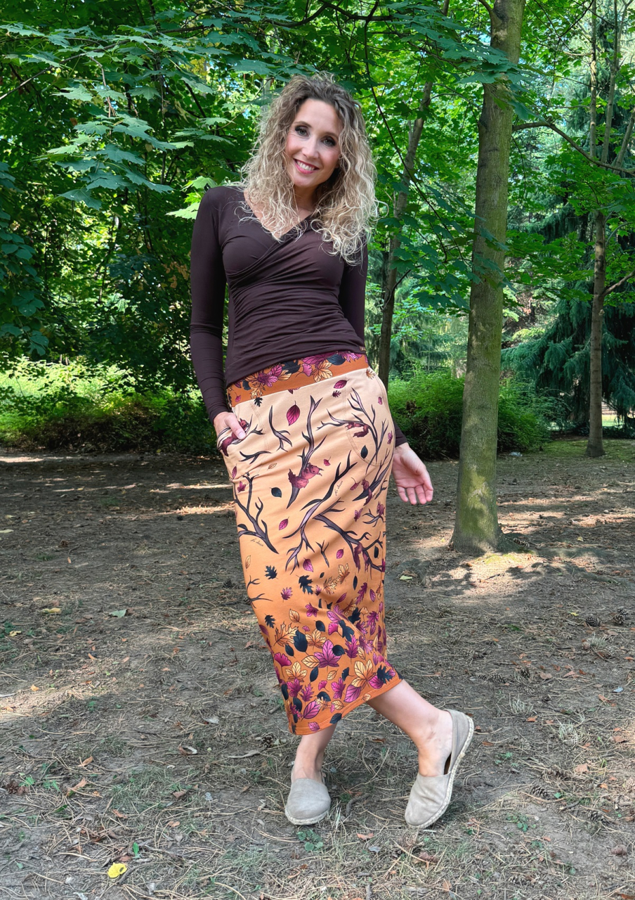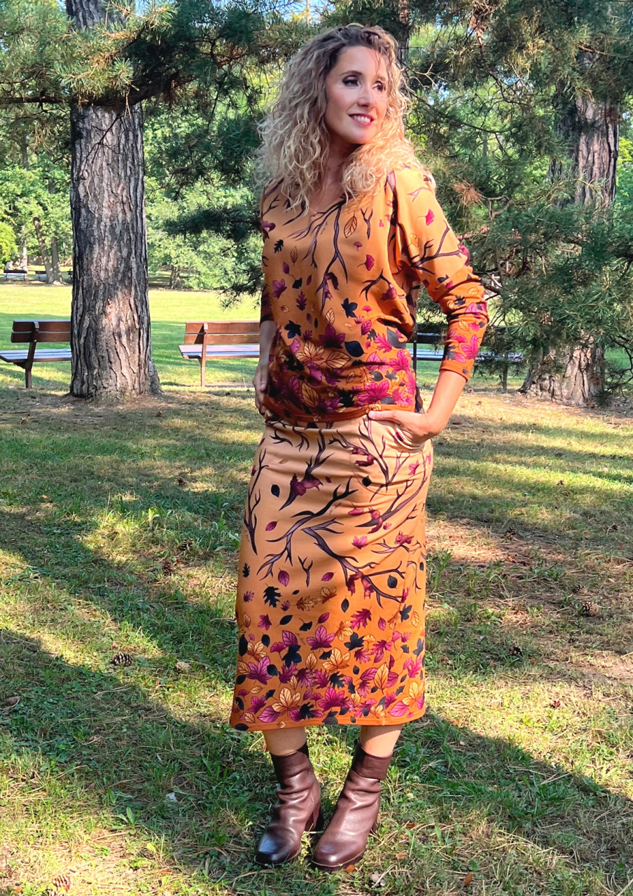 Pohodlná sukně je ušitá z viskźové teplákoviny. V bocích jsou všité kapsy a vzadu malý rozparek.