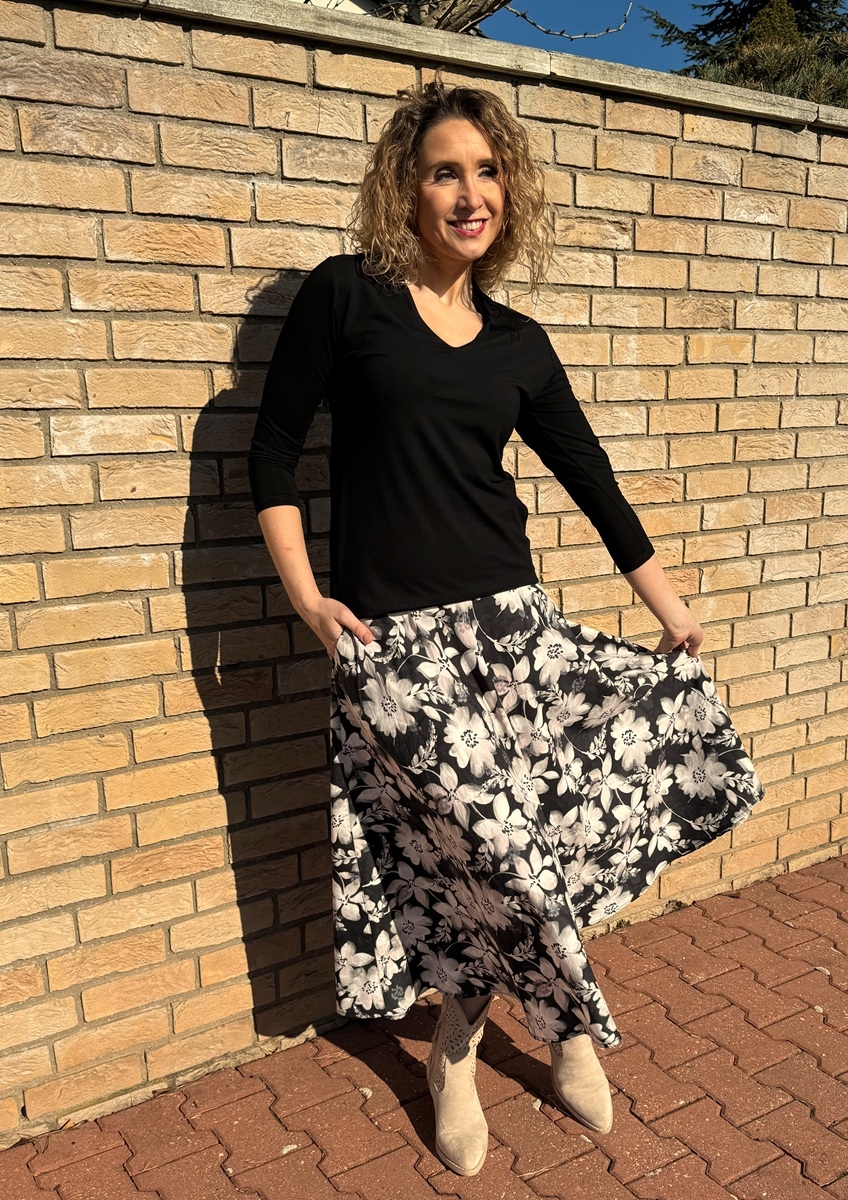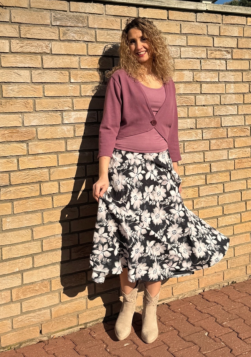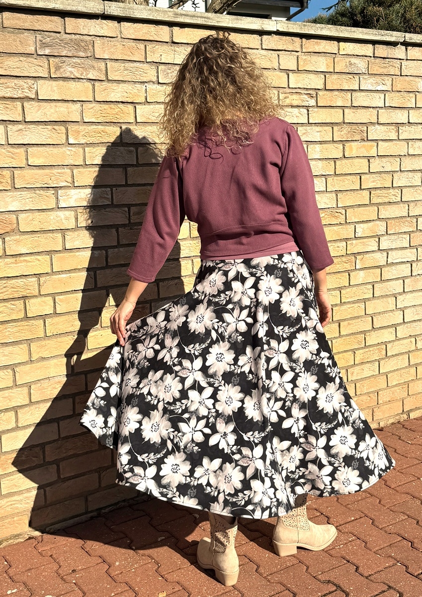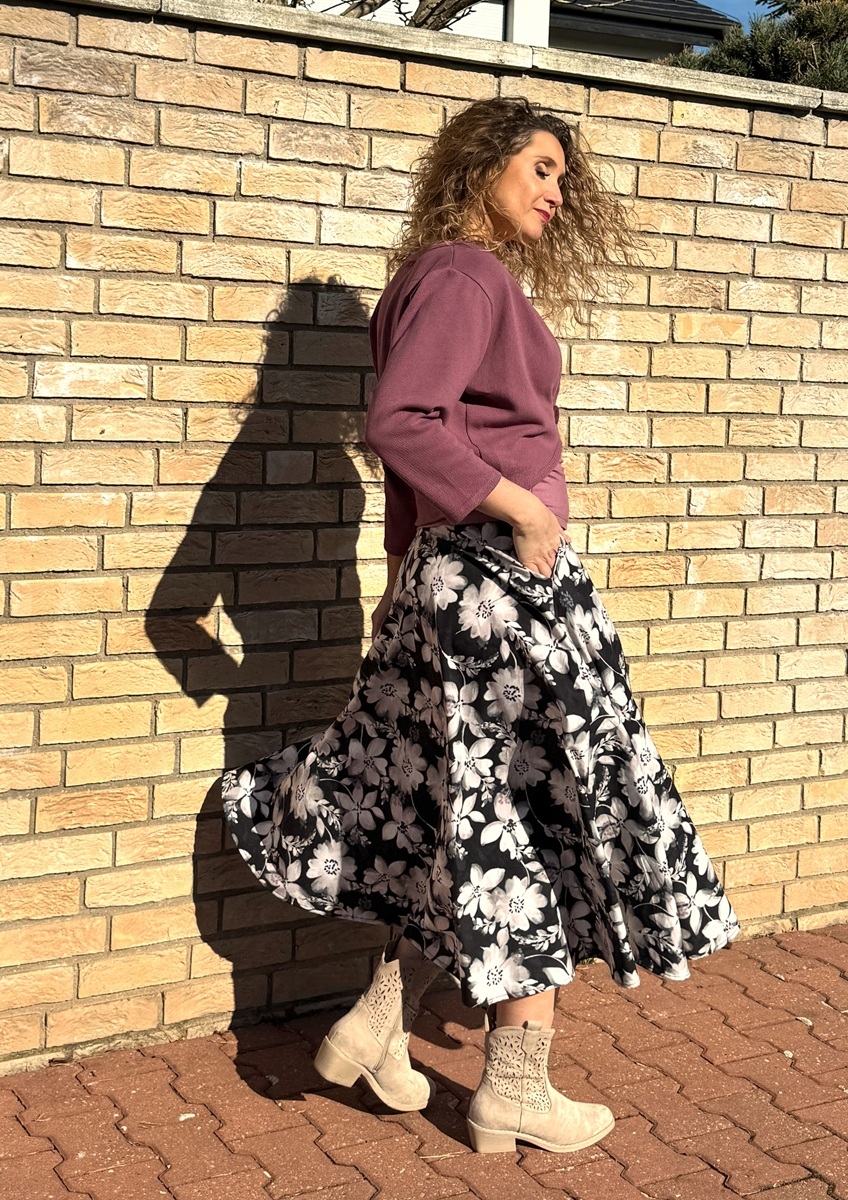 Polokolová sukně je ušitá z úpletu 60% bavlna, 40% viskóza. Pásek je vyztužený proti vytažení.