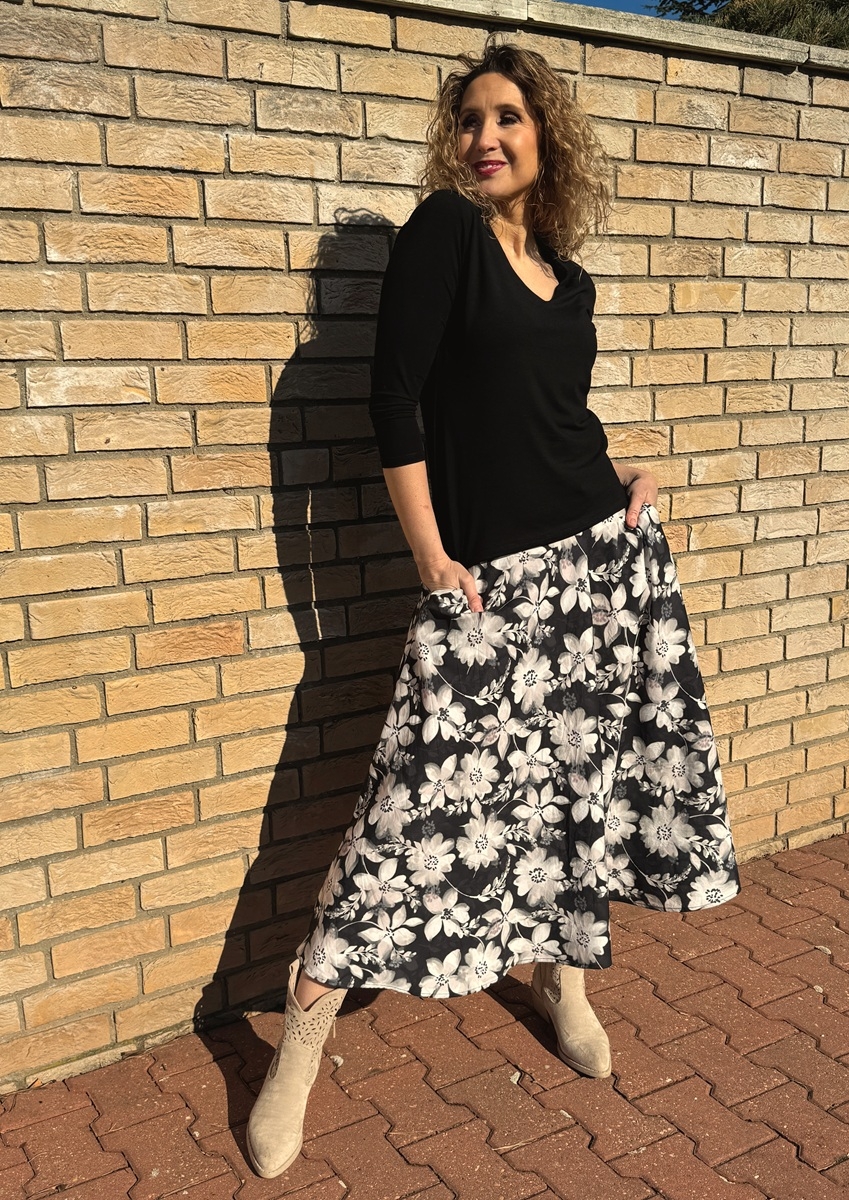 Volná sukně dlouhá bílo černý květ