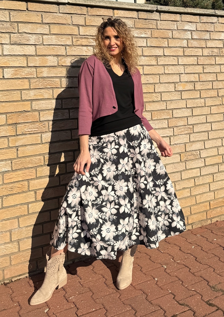 Polokolová sukně  je ušitá z úpletu 60% bavlna, 40% viskóza. Pásek je vyztužený proti vytažení.