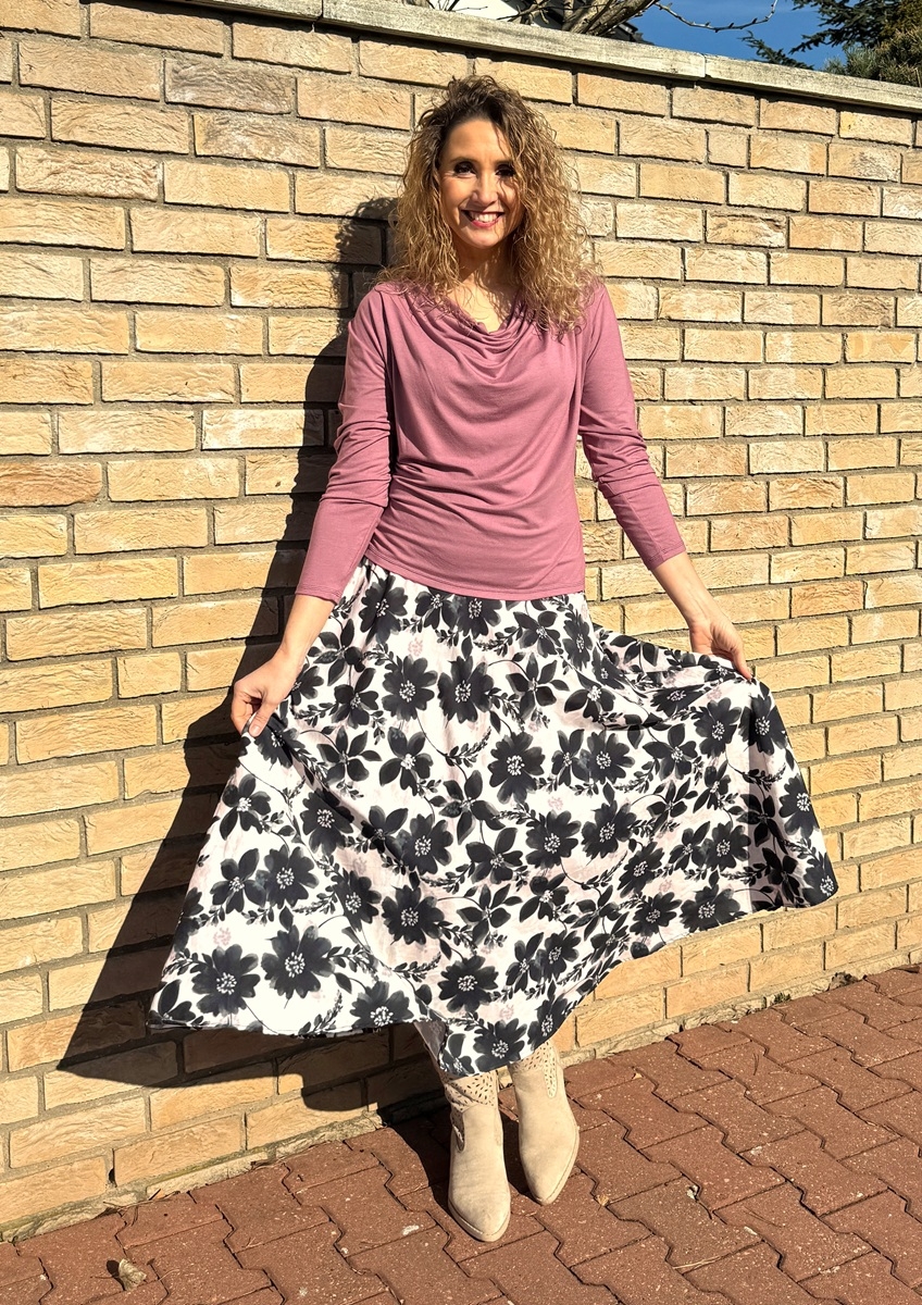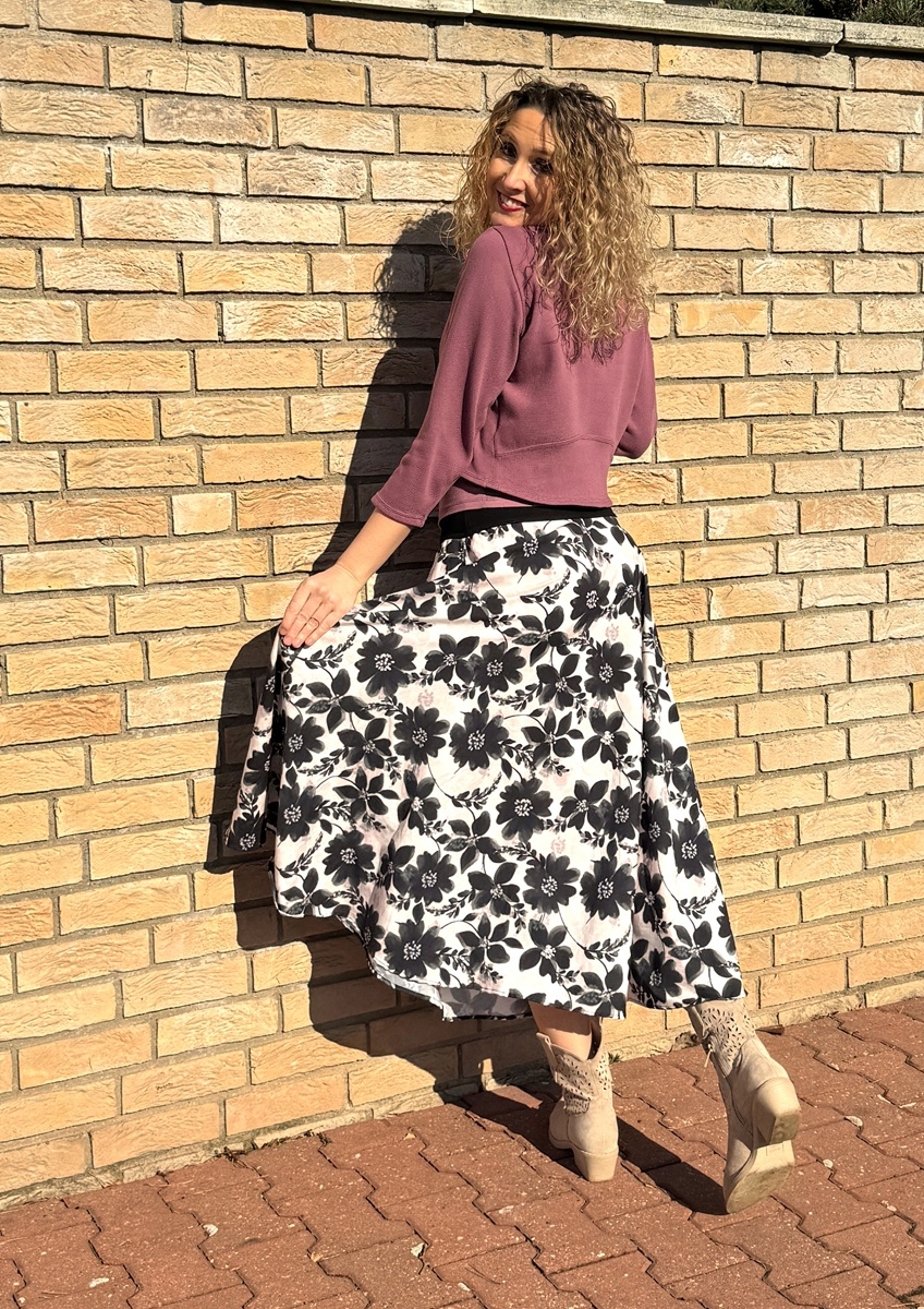 Polokolová sukně je ušitá z úpletu 60% bavlna, 40% viskóza. Pásek je vyztužený proti vytažení.